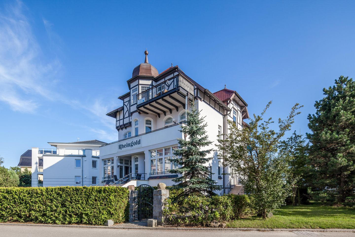 Die Villa Rheingold bietet mit 4 Ferienwohnungen eine Auswahl an 2- und 3- Zimmer-Wohnungen für bis zu 6 Personen. Als Besonderheit können in dieser Villa je zwei Apartments zu einem großen zusammengeschlossen werden. Das Mitbringen von Haustieren ist nicht gestattet. Einige Ferienwohnungen verfügen über einen Seeblick oder Teilseeblick, sowie einem Balkon oder einer Terrasse, auf denen Sie die frische Ostseeluft genießen können. Diese sind jeweils mit einem Duschbad, einer voll ausgestatteten Küchenzeile sowie einem Wohn- und Essbereich mit Kabel TV eingerichtet. WLAN wird Ihnen kostenfrei zur Verfügung gestellt.