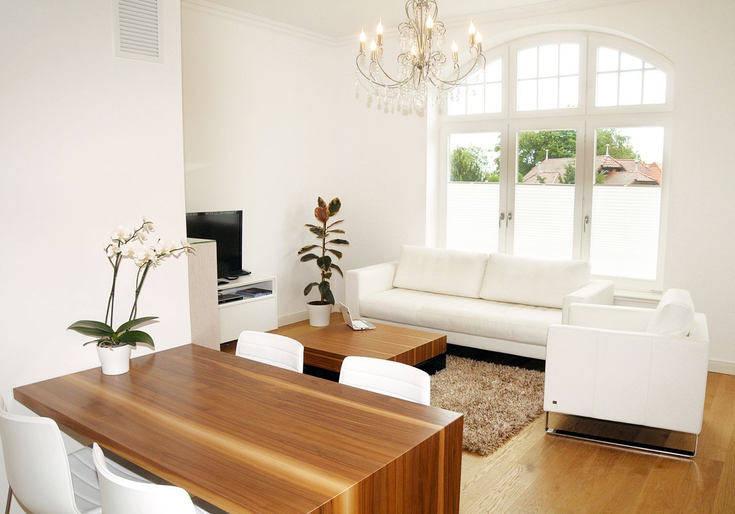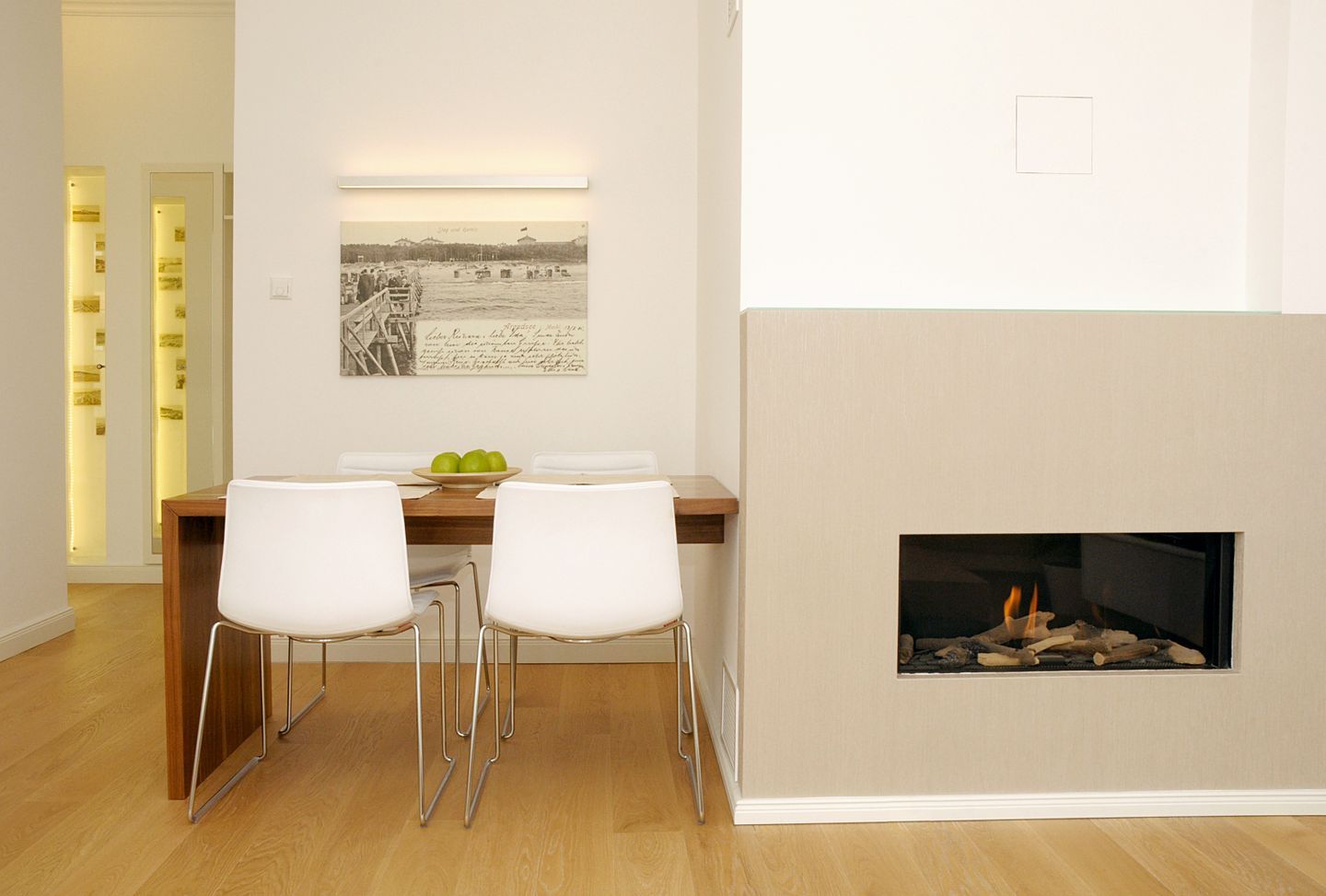 Der stilvolle Wohnbereich der Ferienwohnung lädt Sie mit einer gemütlichen Couch und einem Sessel zu entspannten Abendstunden ein. Für beste Unterhaltung sorgen ein großer Flachbild-TV mit Blu-ray-Disc-/DVD-Player sowie eine Dockingstation. Der Dekokamin (ohne Funktion) unterstreicht die behagliche Atmosphäre. Der angrenzende Essbereich bietet Ihnen ausreichend Platz für gemeinsame Mahlzeiten.