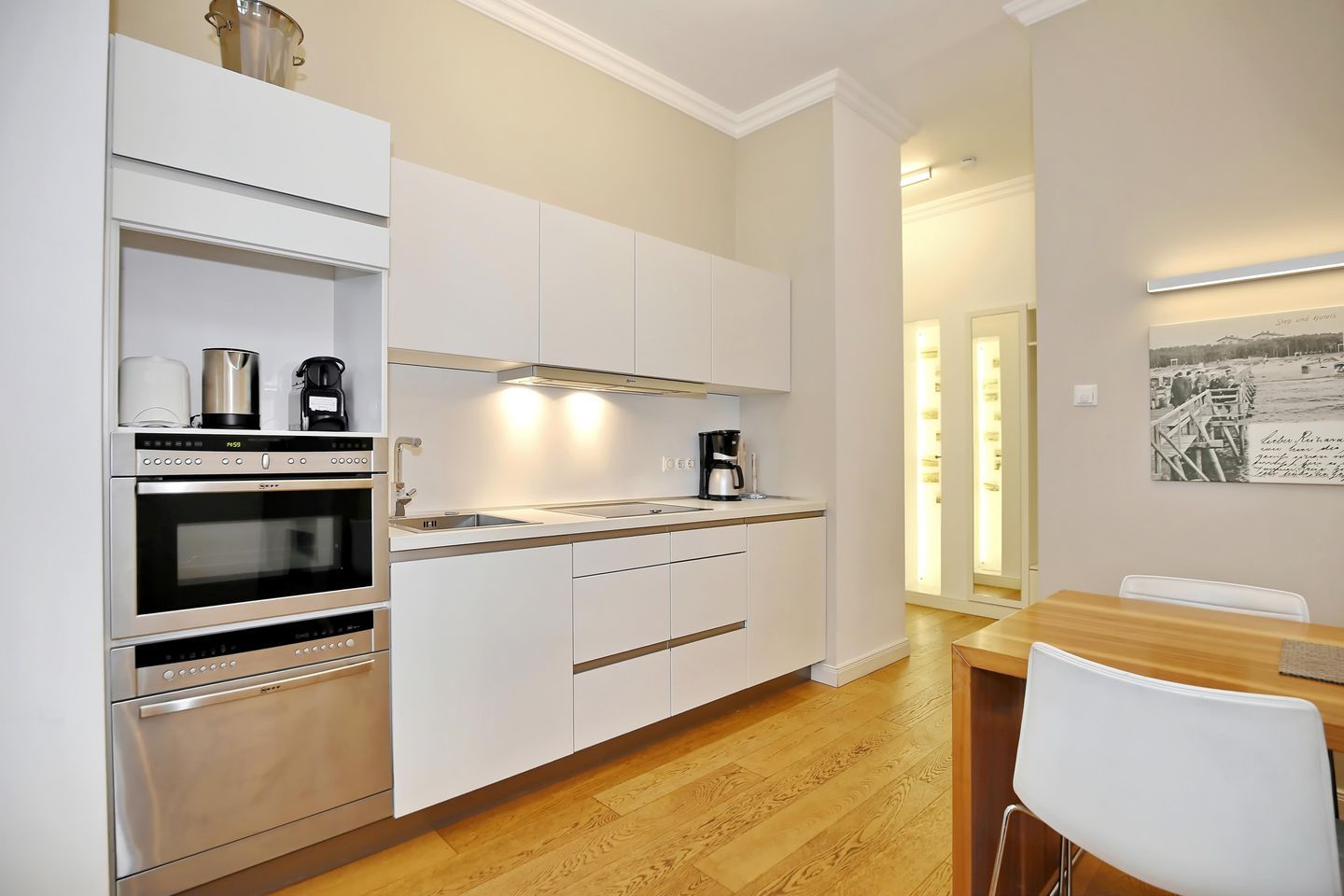 Die moderne Küchenzeile ist mit einem 4-Zonen-Cerankochfeld, einem Backofen, einer Mikrowelle, einem Geschirrspüler sowie einem Kühlschrank mit Gefrierfach voll ausgestattet. Technische Kleingeräte wie ein Wasserkocher, ein Toaster, eine Kaffeemaschine sowie eine Nespresso-Maschine von De’Longhi runden die offene Küche ab.
