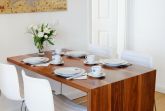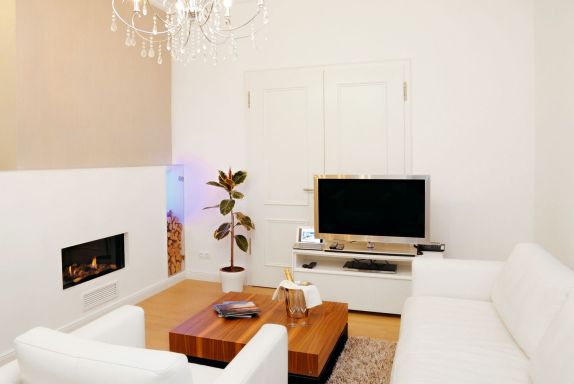 Im stilvollen Wohnzimmer der Ferienwohnung erwarten Sie eine gemütliche Couch und ein Sessel für entspannte Abende. Ein großer Flachbildfernseher mit Blu-ray-Disc-/DVD-Player sowie eine Dockingstation sorgen für beste Unterhaltung. Der Dekokamin (ohne Funktion) trägt zur behaglichen Atmosphäre des Wohnbereichs bei. Der angrenzende Essbereich bietet ausreichend Platz für gemeinsame Mahlzeiten.
