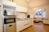 Die moderne Küchenzeile ist mit einem 2-Zonen-Cerankochfeld, einem Backofen, einer Mikrowelle, einem Geschirrspüler sowie einem Kühlschrank mit Gefrierfach ausgestattet. Kleine technische Geräte wie ein Wasserkocher, ein Toaster und eine Kaffeemaschine vervollständigen die offene Küche.