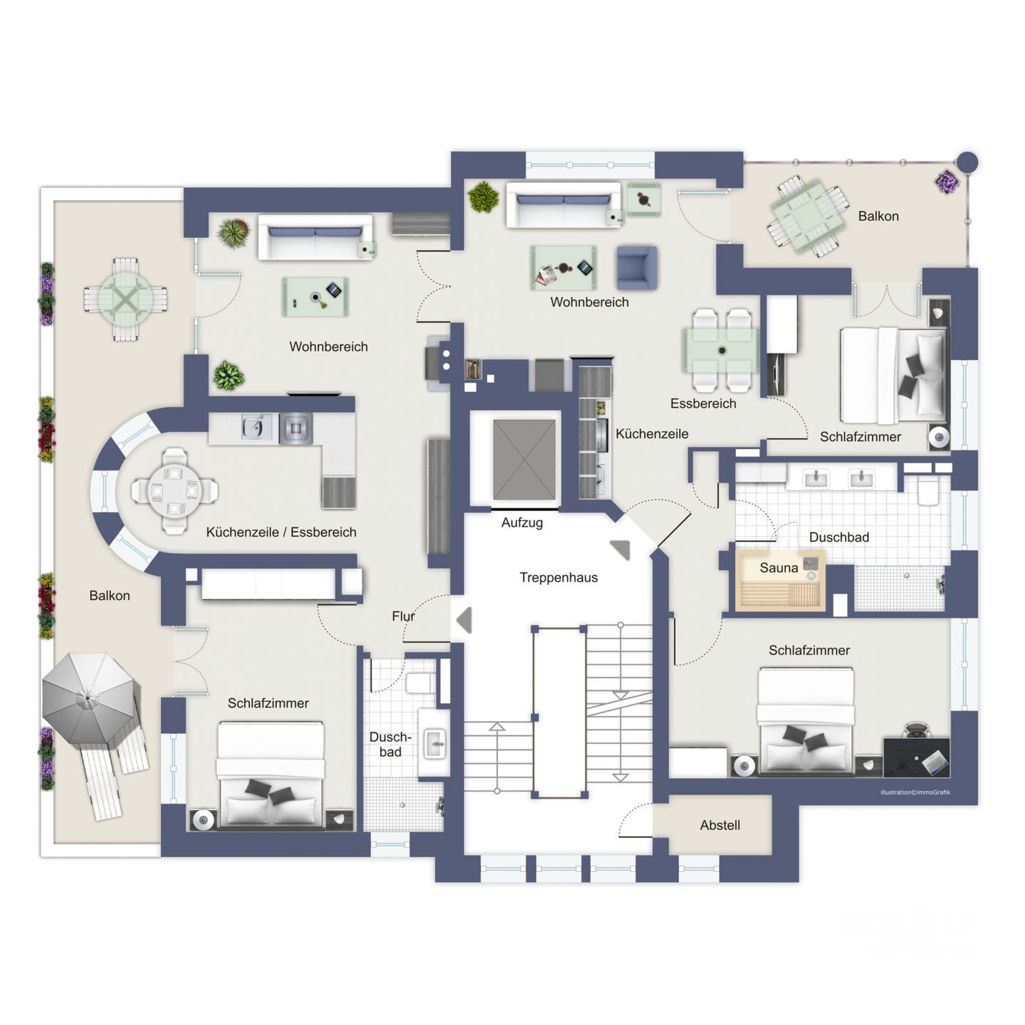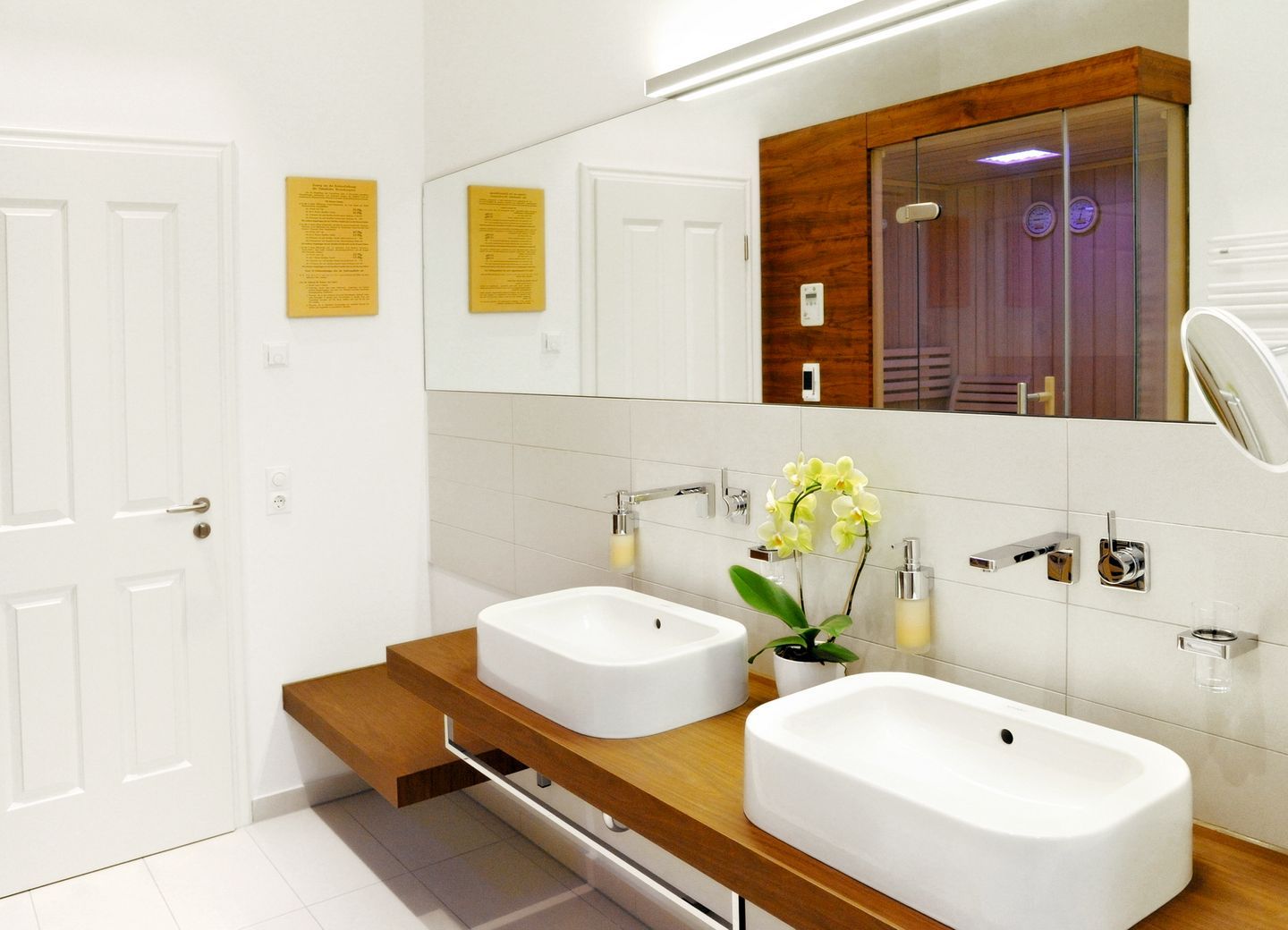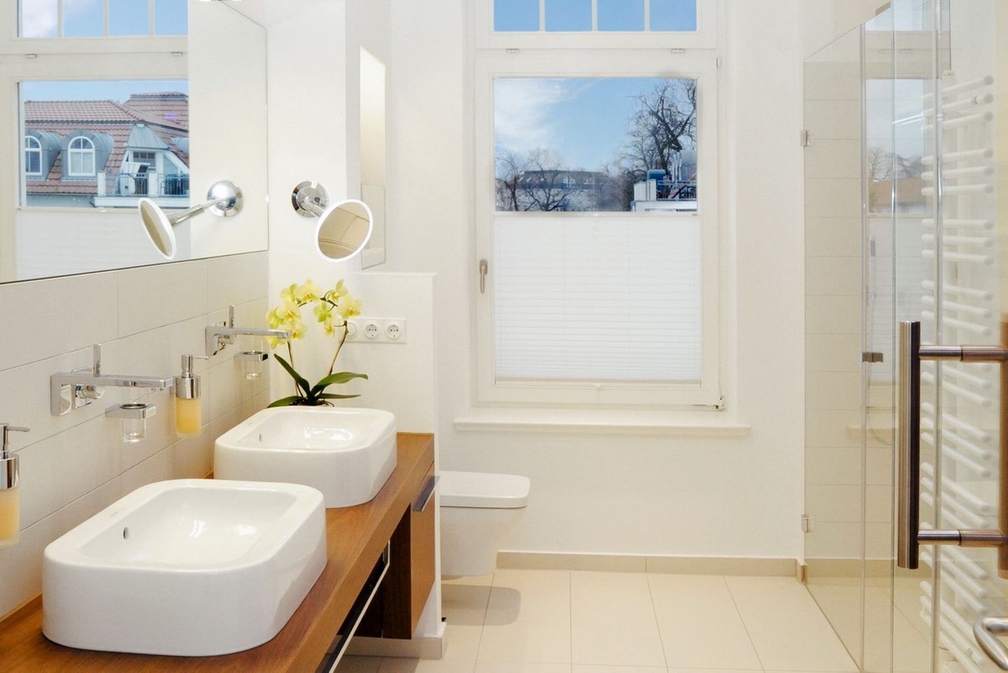 Die gefliesten Tageslichtbäder sind hell und modern gestaltet und verfügen über ebenerdige Duschen, WCs, Waschtische mit Waschbecken sowie große beleuchtete Spiegel. Beide Bäder sind zudem mit einem Kosmetikspiegel und einem Föhn ausgestattet. Das Bad der Wohnung „Hagen von Tronje“ bietet Ihnen mit seiner integrierten Sauna besonders entspannende Wohlfühlmomente.