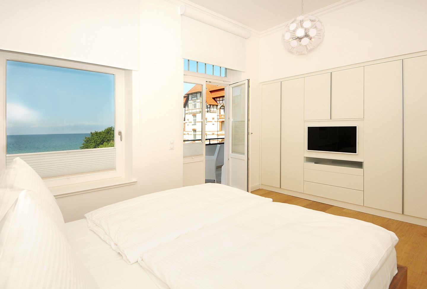 Die Schlafzimmer der Ferienwohnung sind komfortabel eingerichtet und bieten Ihnen erholsame Rückzugsorte. Große Kleiderschränke sorgen für ausreichend Stauraum für Ihr Urlaubsgepäck. Flachbildfernseher bieten zusätzliche Unterhaltung in den Abendstunden. Plissees dienen an allen Fenstern als Sichtschutz.