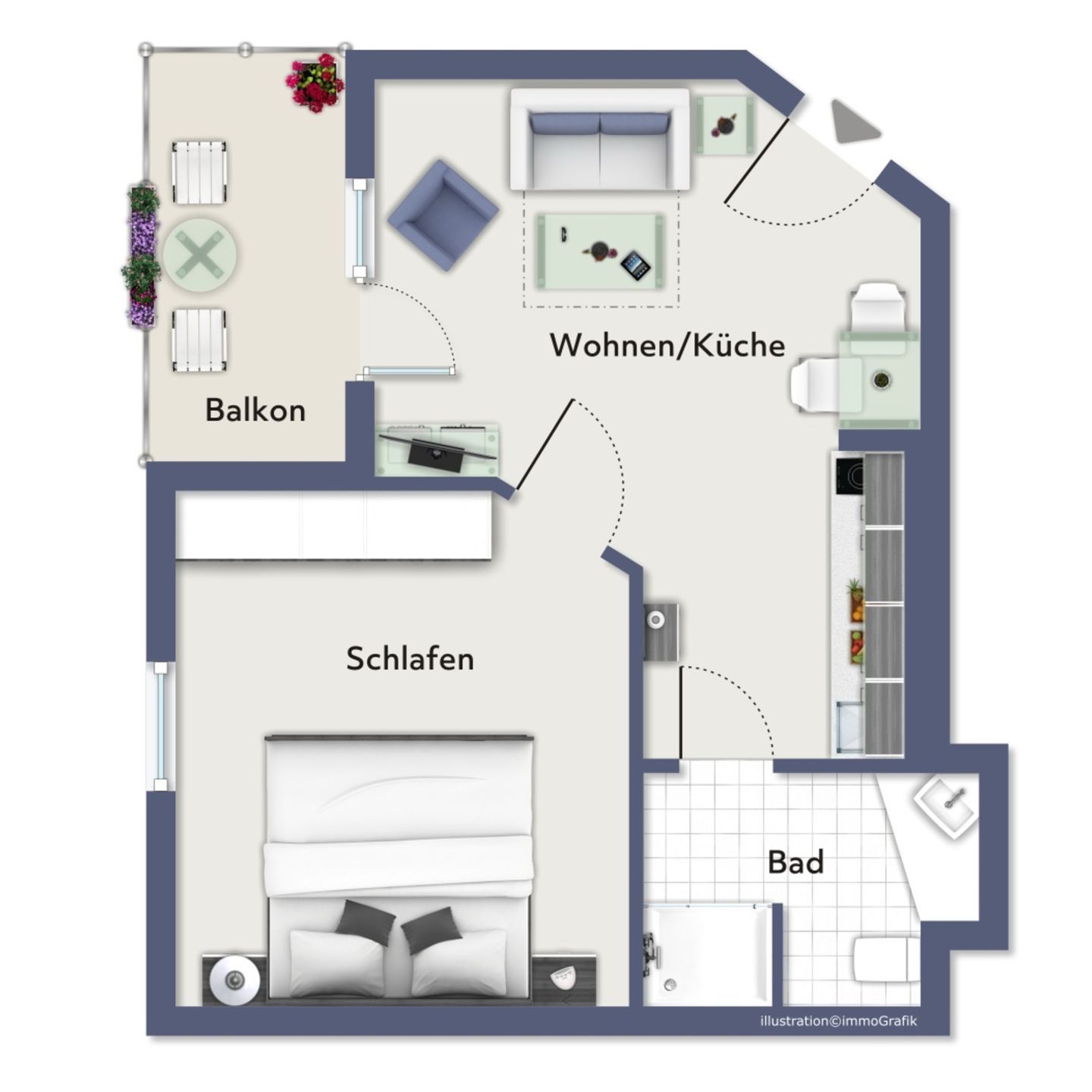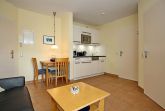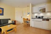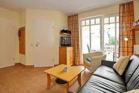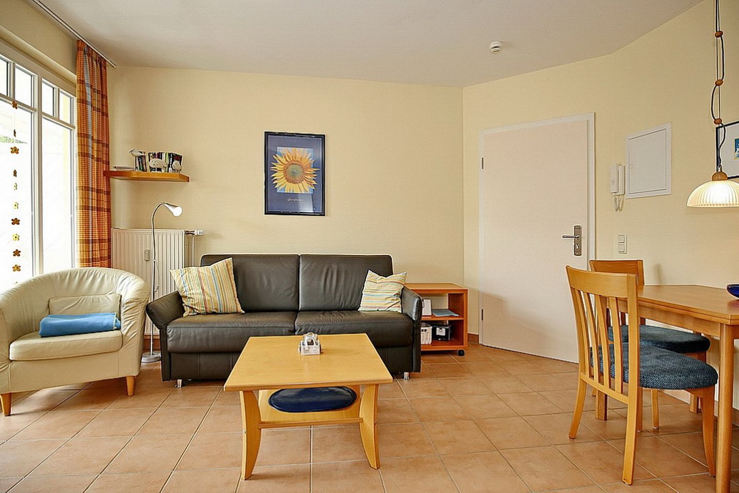 Der Wohnbereich ist für Sie mit einer Schlafcouch, einem Couchtisch, einer Kommode und einem Flachbild-TV gemütlich eingerichtet. Von hier aus gelangen Sie auf den Balkon der Ferienwohnung. Der Essbereich bietet Ihnen ausreichend Platz für gemeinsame Mahlzeiten.