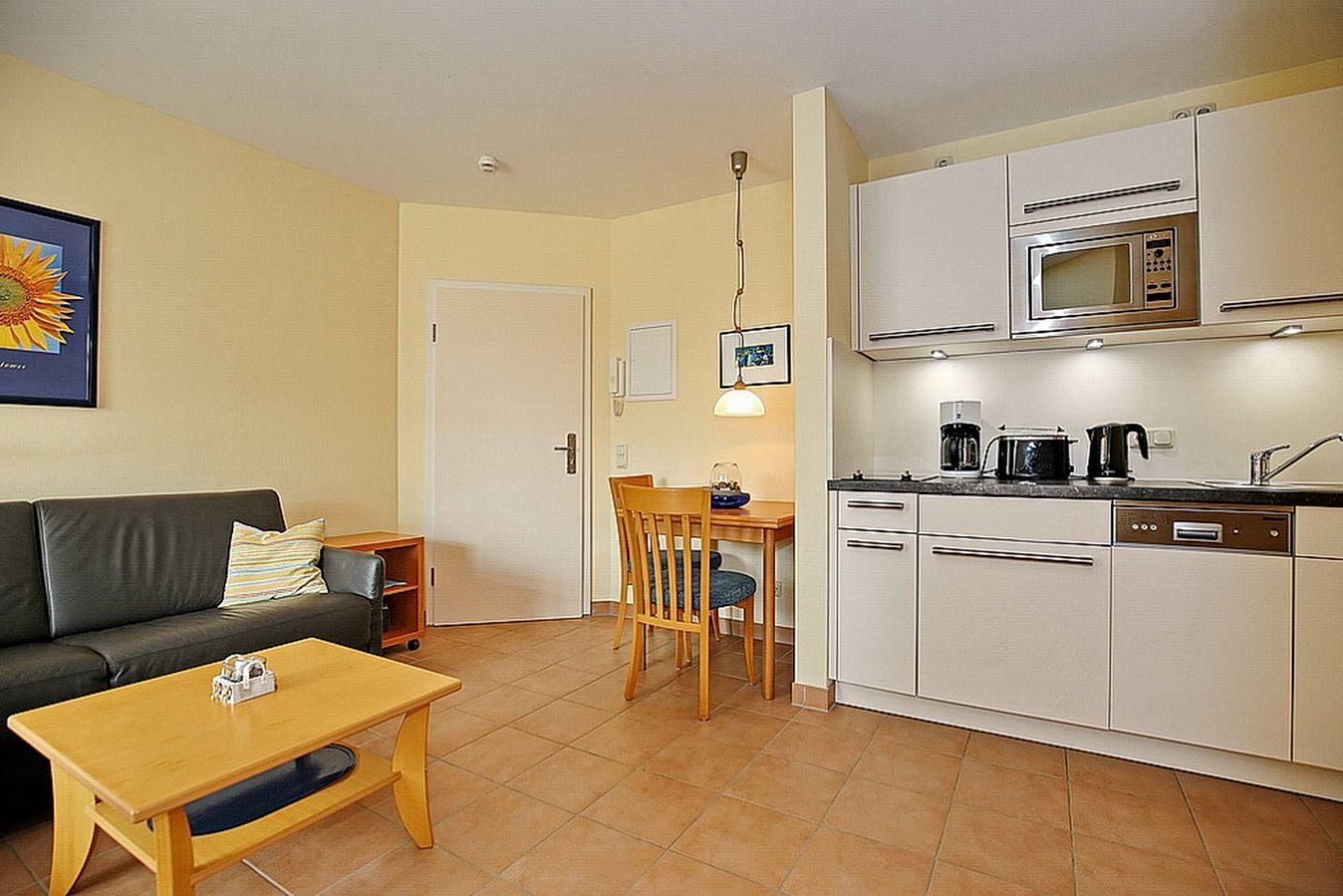 Die Küchenzeile der Ferienwohnung verfügt über einen Wasserkocher, eine Kaffeemaschine, einen Geschirrspüler, einen Kühlschrank, einen Toaster sowie eine Mikrowelle. Zum Kochen steht Ihnen ein 2-Platten-Cerankochfeld zur Verfügung.