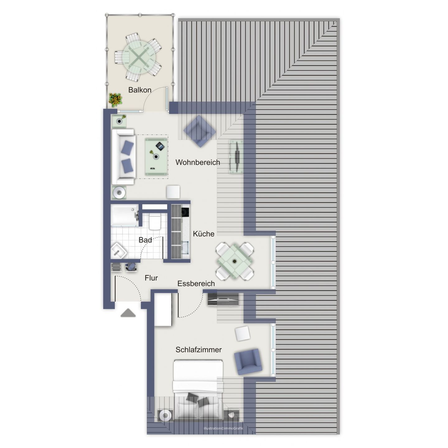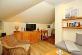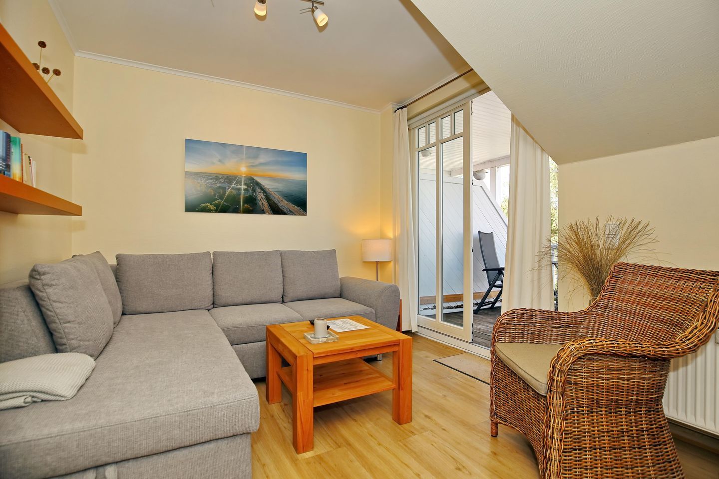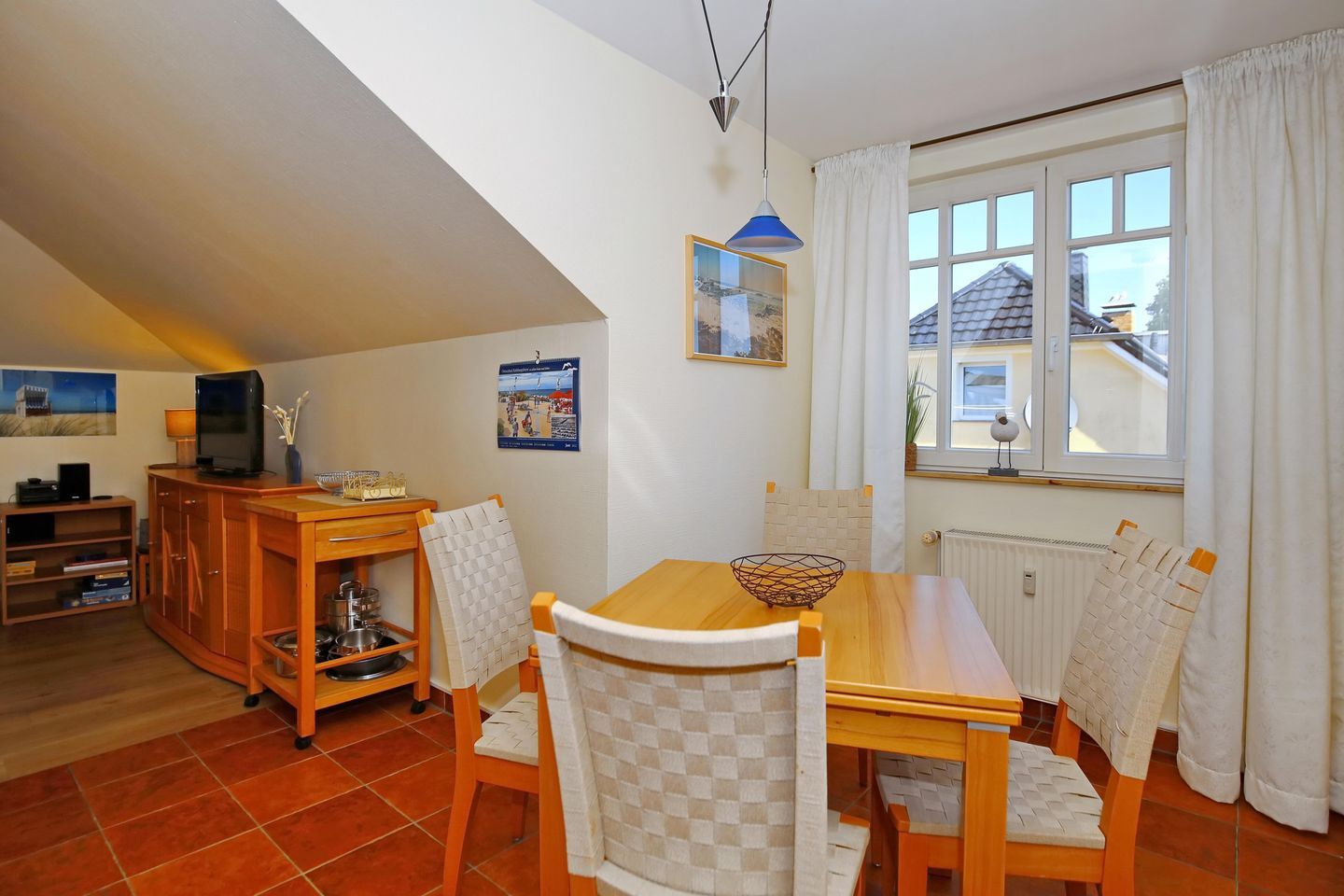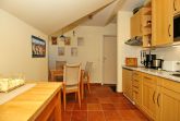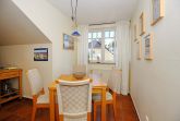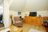 Der Wohnbereich ist für dich mit einer Couch, einem Korbsessel, einem Couchtisch, einer Stereoanlage, einer Kommode und einem Flachbild-TV gemütlich eingerichtet. Von hier aus gelangst du auf den Balkon der Ferienwohnung. Der Essbereich bietet dir ausreichend Platz für gemeinsame Mahlzeiten.