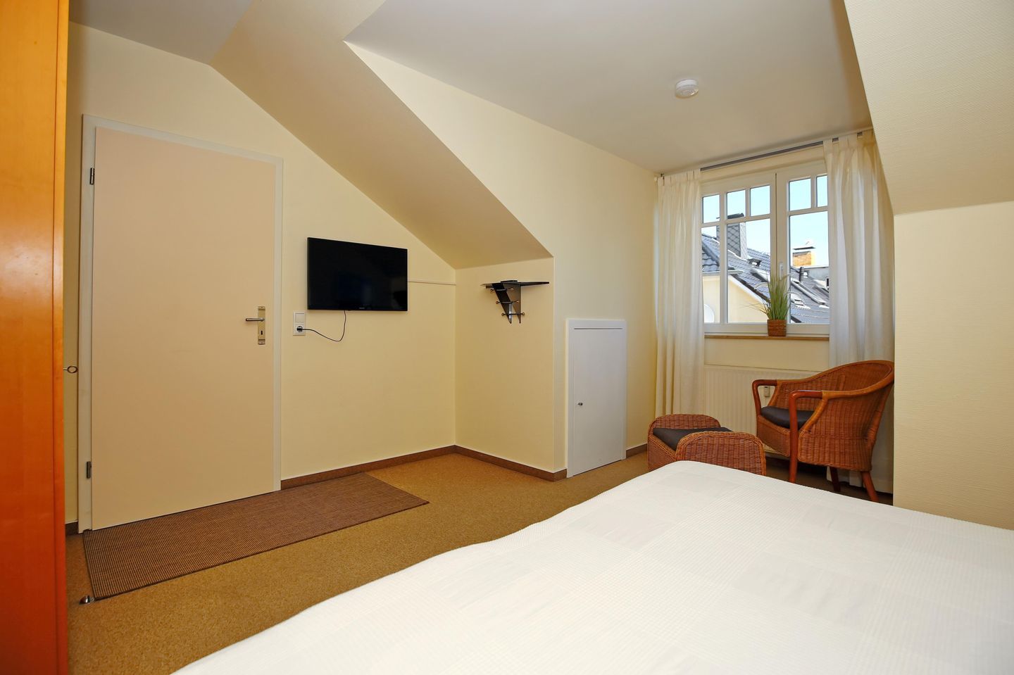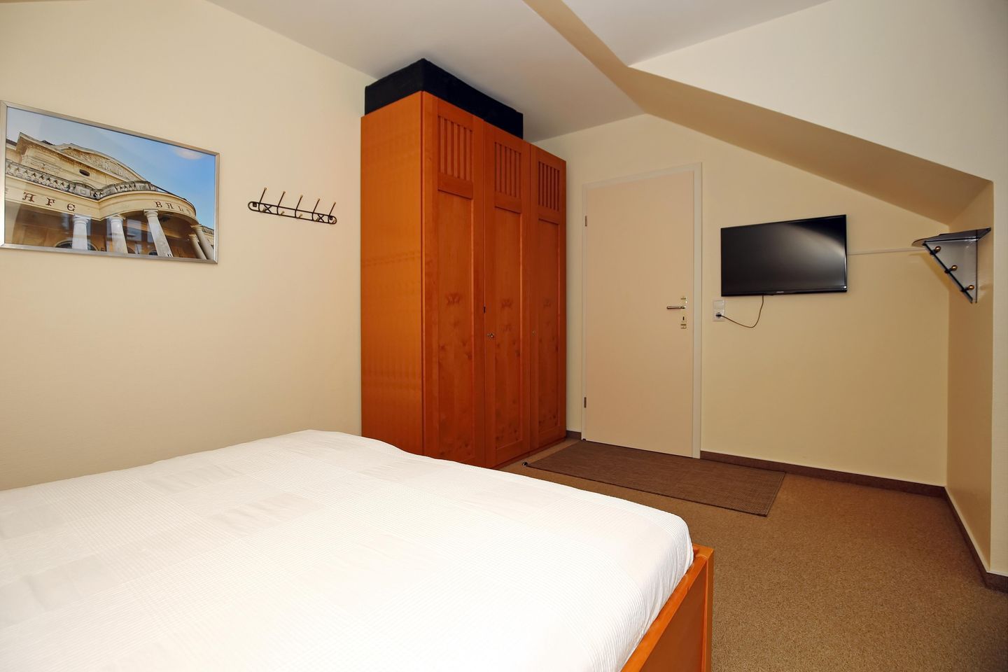 Das Schlafzimmer lädt dich mit einem bequemen Doppelbett zur erholsamen Nachtruhe ein. Zur medialen Unterhaltung bietet sich der vorhandene Flachbild-TV an. Ein Kleiderschrank bietet dir hier Stauraum für dein Urlaubsgepäck. Die Schlafcouch im Wohnbereich der Ferienwohnung wird schnell zu einem bequemen Schlafplatz für eine weitere Person.