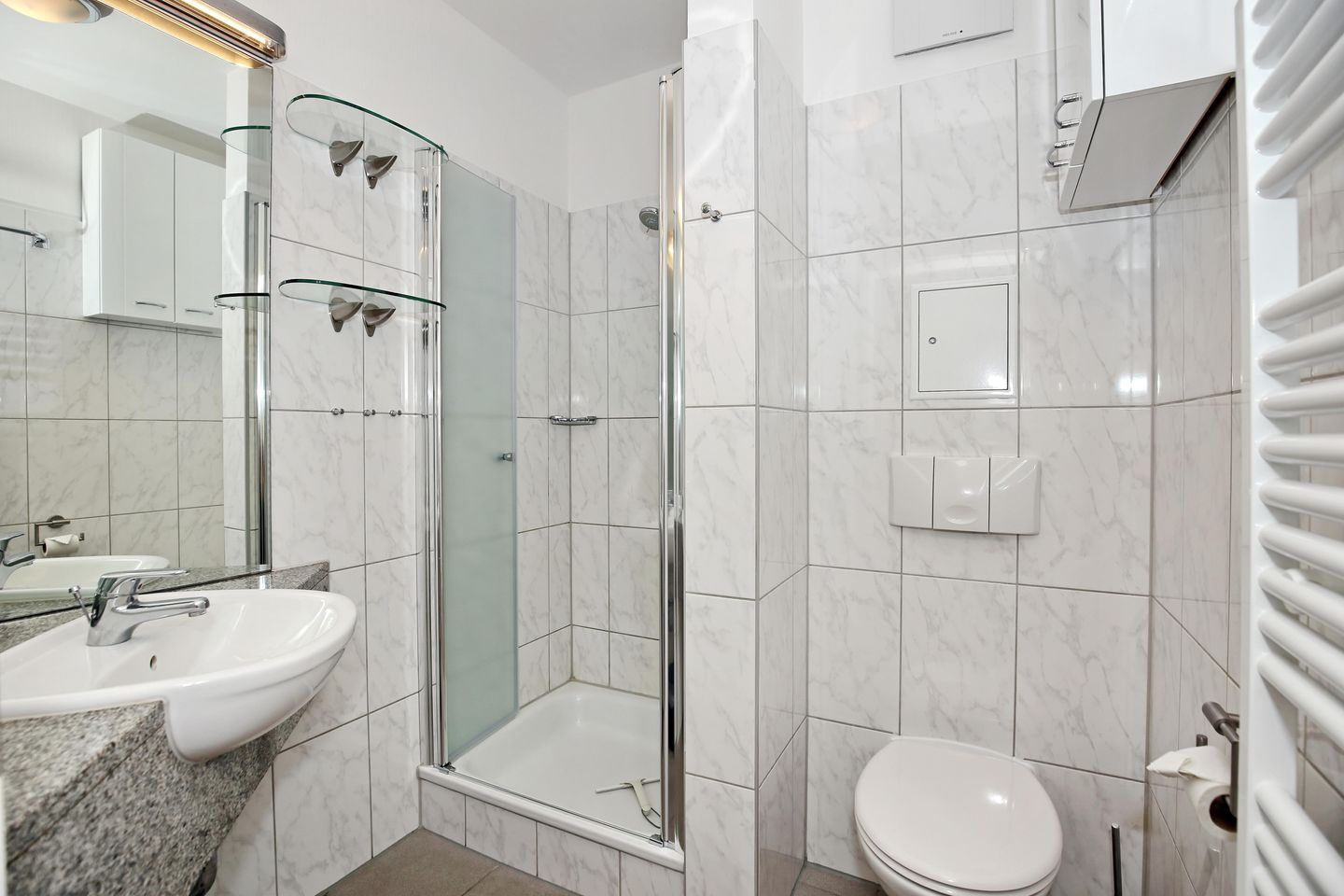 Die Ferienwohnung verfügt über ein Duschbad mit WC sowie einen Föhn. Die Wohnung ist gefliest. Im Wohnbereich wurde Laminat und im Schlafbereich Teppich verlegt.
