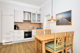 Der Esstisch und die Küchenzeile sind im Wohnraum integriert. Die Küche wartet mit einem Geschirrspüler, Herd mit Backofen, einem 4-Zonen-Cerankochfeld sowie einem Kühlschrank mit Gefrierfach auf. Selbstverständlich stehen Kaffeemaschine, Wasserkocher und Toaster ebenfalls bereit.