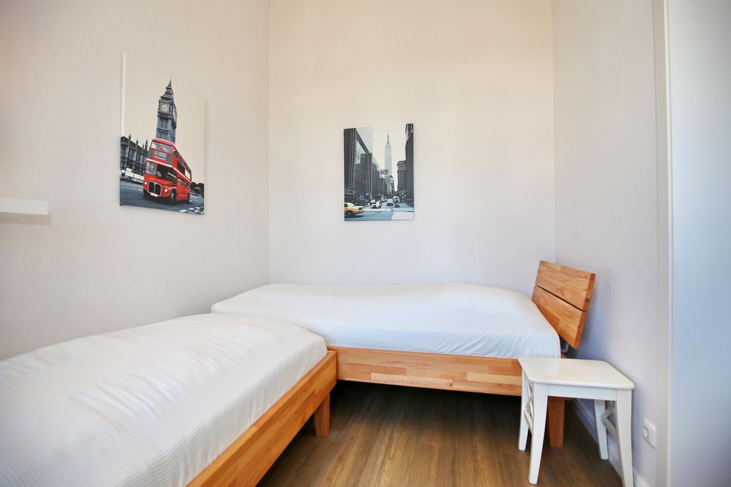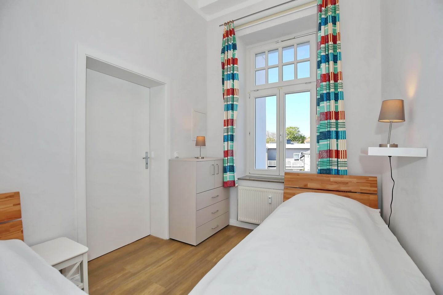 Im ersten Schlafzimmer der Ferienwohnung steht dir ein großes Doppelbett zur Verfügung. Das zweite Schlafzimmer ist mit zwei Einzelbetten ausgestattet. Deine Urlaubsgarderobe und Reiseutensilien bringst du im geräumigen Kleiderschrank unter. An den Fenstern dienen Vorhänge als Verdunklungsmöglichkeit.