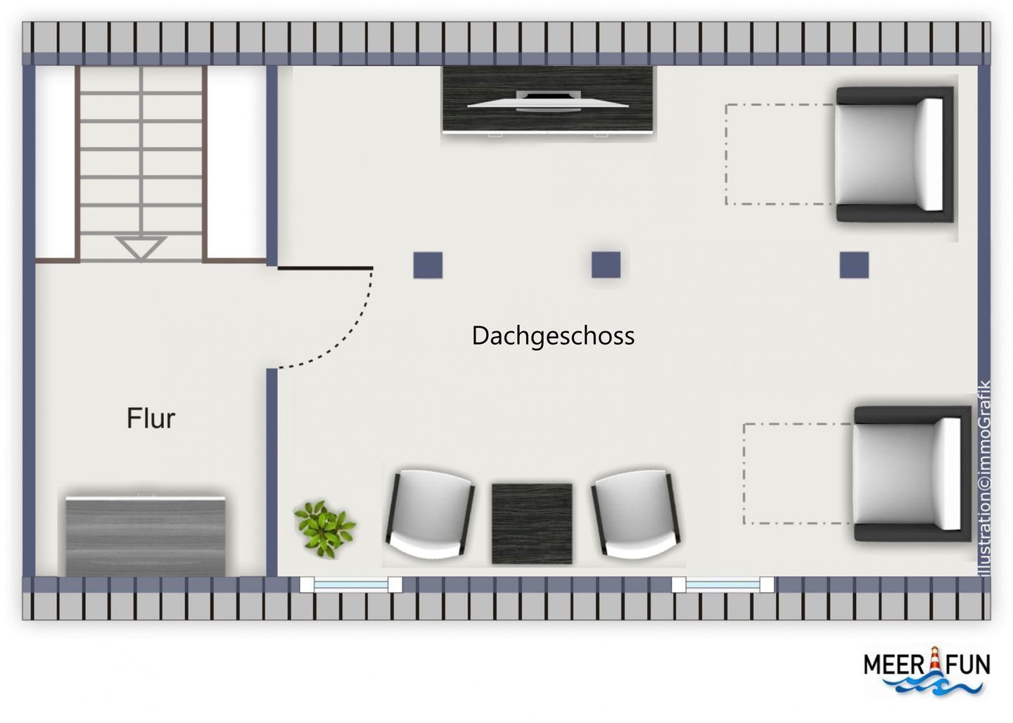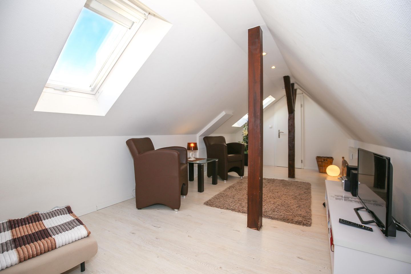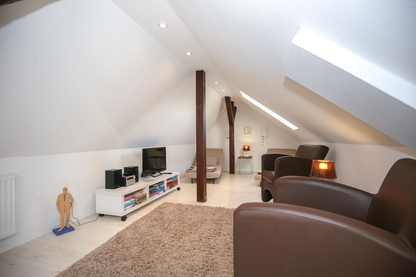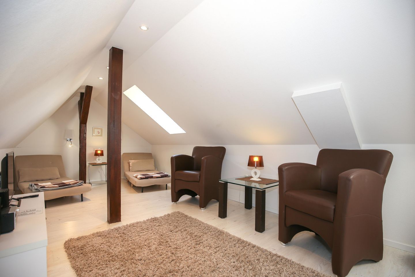 Der ausgebaute Spitzboden mit 2 Veluxfenstern und ca. 12 qm Wohnfläche steht Dir als Aufenthaltsraum zur Verfügung. Hier kannst Du lesen, Musik hören, fernsehen oder einfach nur relaxen. Für Deine Kinder ist es ein schöner Gemeinschafts- und Spielraum. Als Schlafraum für die Nacht darf der Raum nicht genutzt werden.