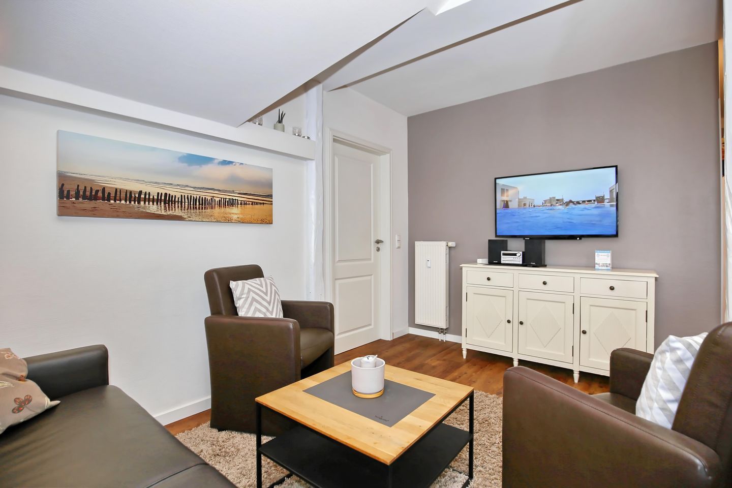 Genug Stauraum durch Schränke und Kommode ist auch hier für Deine Urlaubsgarderobe vorhanden. Auch ist der Raum groß genug für ein Kinderreisebett. Für den gemütlichen Tagesausklang steht ein zweiter Flachbild-TV zur Verfügung.