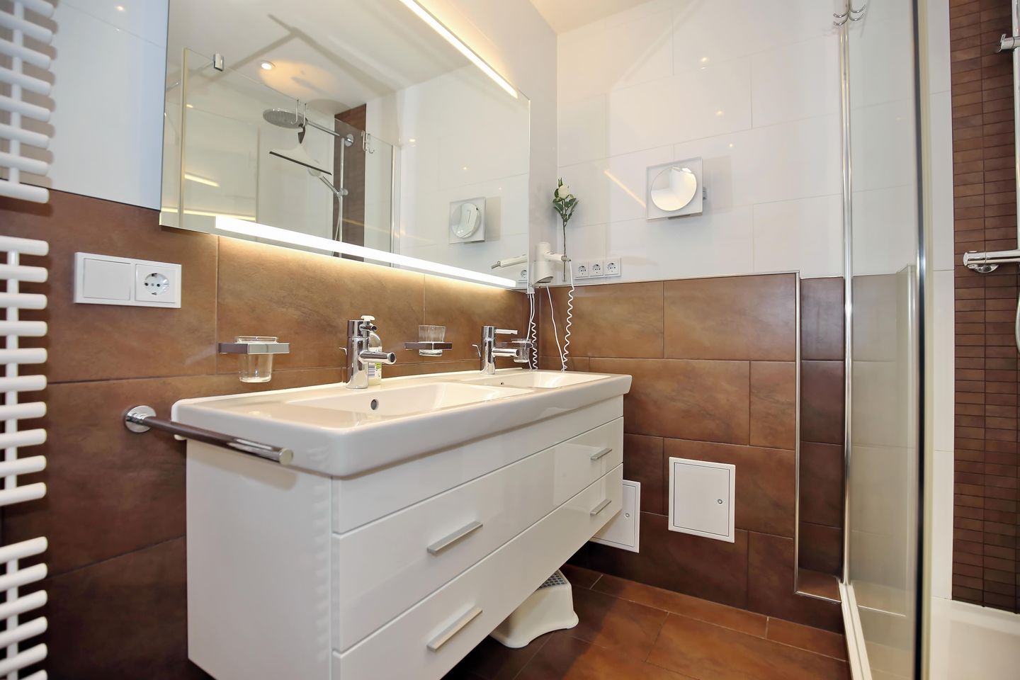Das moderne Badezimmer mit Doppelwaschtisch und großzügiger Dusche mit flachem Einstieg lädt zum Wohlfühlen ein. Wand-Föhn, Kosmetikspiegel und ein Handtuch-Heizkörper komplettieren das Bad. Die komplette Wohnung ist, außer im Bad, mit einem hochwertigem Vinylboden ausgestattet.