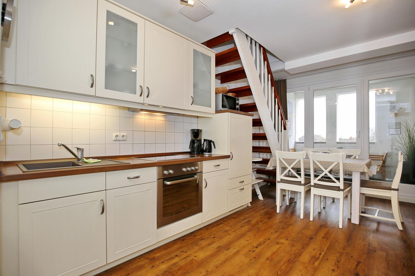 Die Küchenzeile mit viel Stauraum beinhaltet einen 4-Platten-Herd mit einem Backofen, Mikrowelle, Kühlschrank mit Gefrierfach, Geschirrspülmaschine, Kaffeemaschine, Wasserkocher etc.