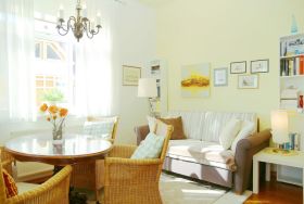 Die liebevoll sanierte Villa beherbergt sechs Apartments, die zum Teil über Ausstattungsmerkmale wie TV, Backofen, DVD-Player und PKW-Stellplatz verfügen.