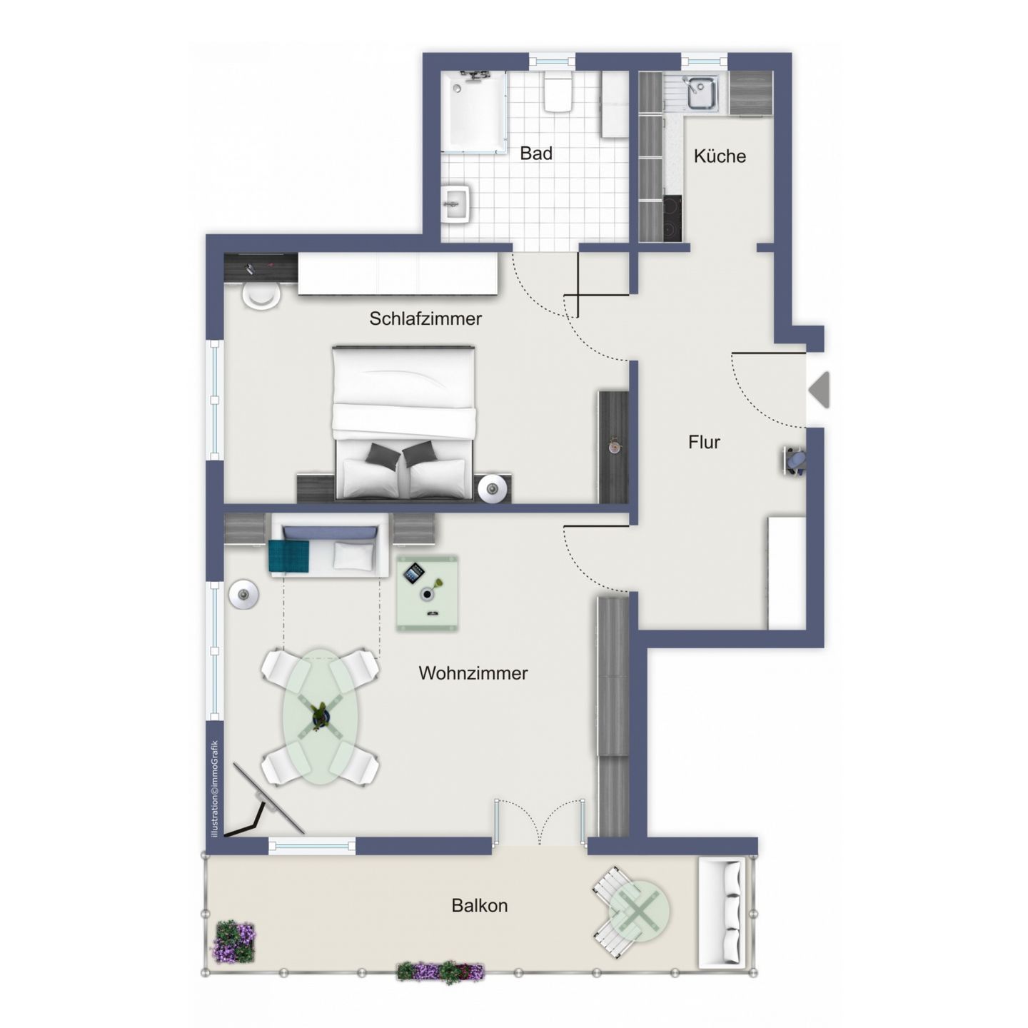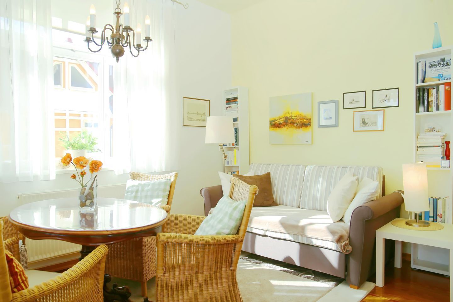 Das liebevoll ausgestattete Wohnzimmer lädt mit einer bequemen Schlafcouch zu entspannten Stunden ein. Eine Auswahl an Büchern und Gesellschaftsspielen sorgt für zusätzliche Unterhaltung. Ein Flachbild-TV und ein Radio runden den Bereich ab. Vom Wohnzimmer aus gelangen Sie direkt auf die ca. 10 m² große Loggia, auf der Sie bei einem Frühstück die Morgensonne genießen können.