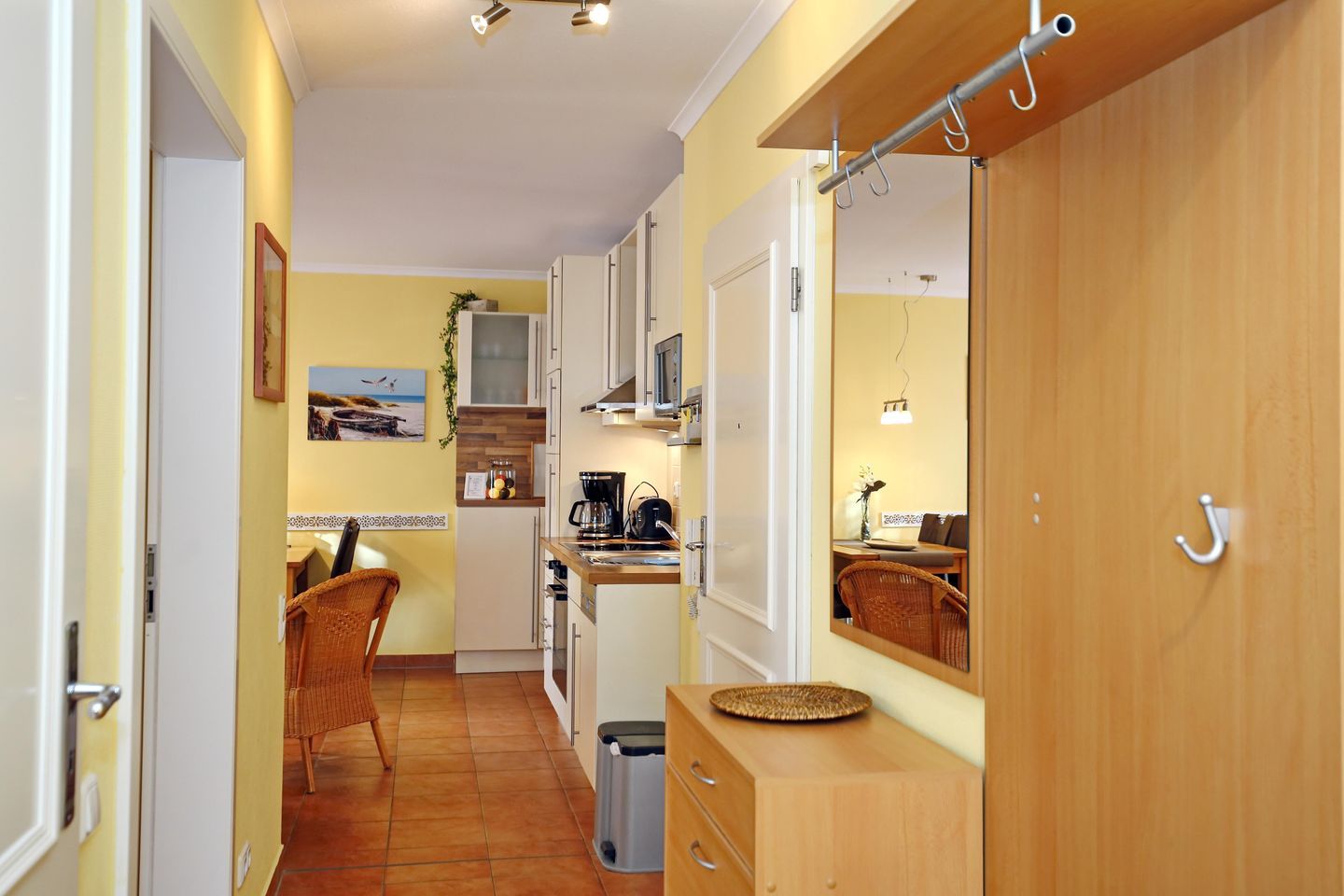 Die sehr geschmackvoll eingerichtete Küchenzeile lässt kaum Wünsche offen. Ein Herd mit Backofen und einem 4-Platten-Cerankochfeld, eine Kühl-/Gefrierkombination sowie ein Geschirrspüler gehören zur umfassenden Kücheneinrichtung. Kleingeräte wie ein Toaster, eine Kaffeemaschine und ein Wasserkocher komplettieren die Ausstattung.