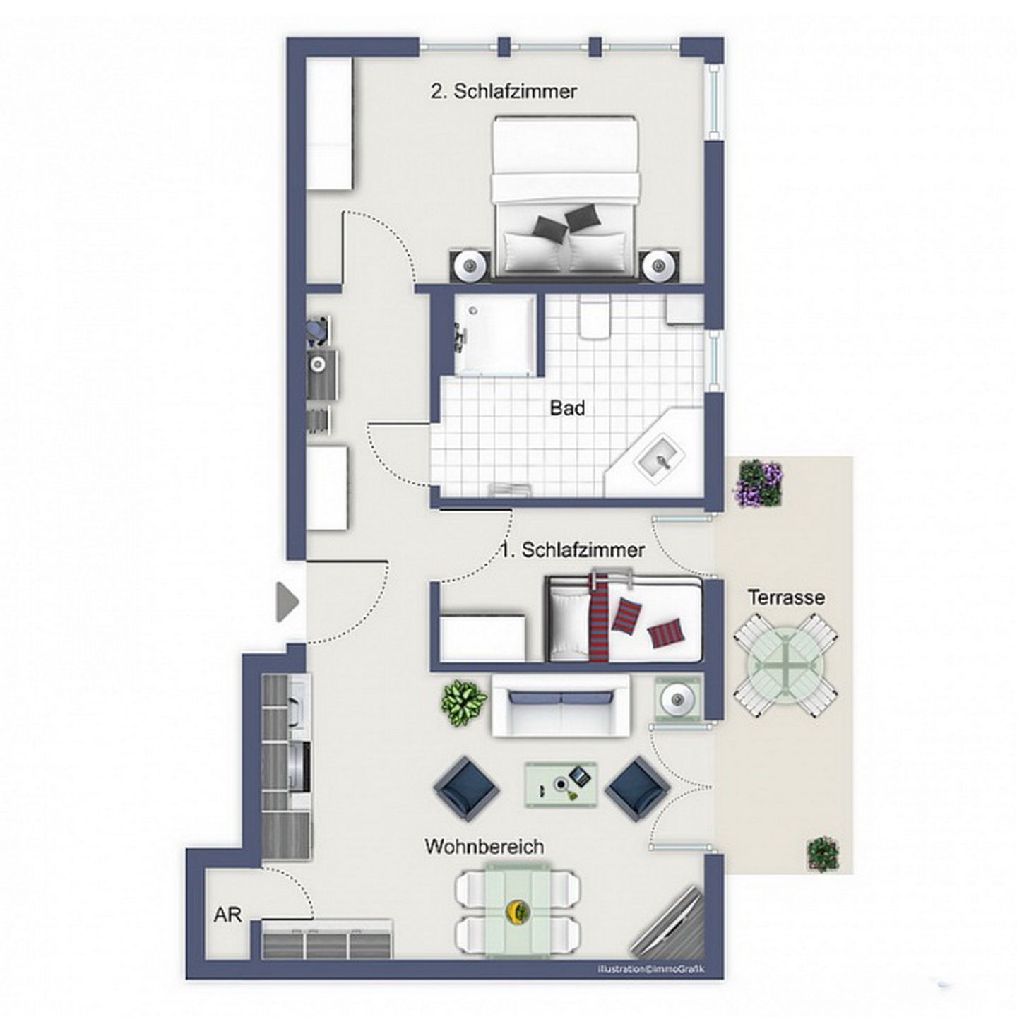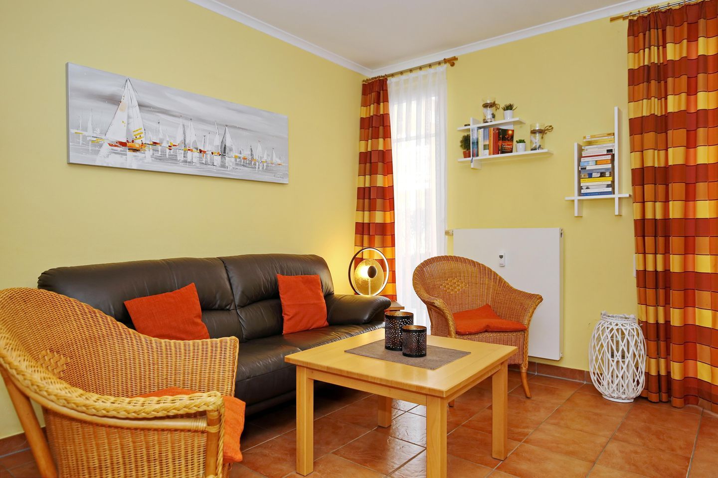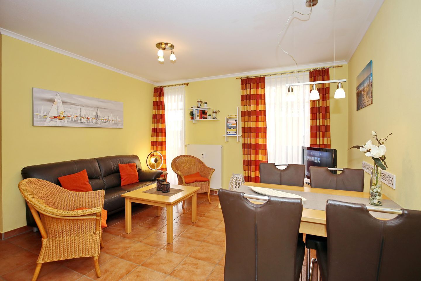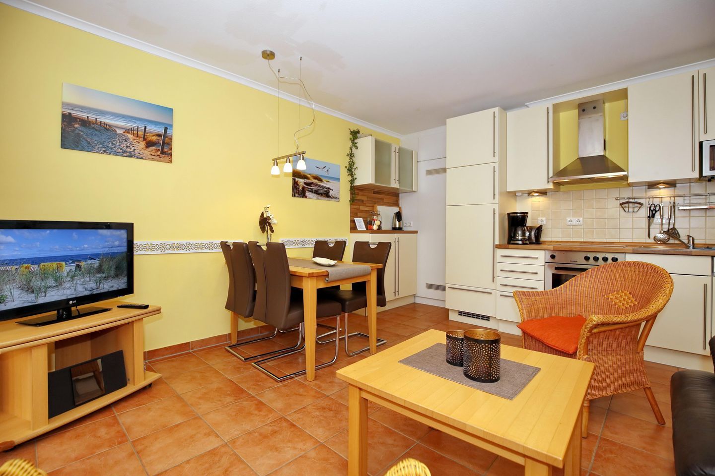 Der Wohnbereich lädt dich mit einem bequemen Sofa und zwei Korbsesseln, einer Stereoanlage sowie einem Flachbild-TV zu gemütlichen Stunden ein. Der integrierte Essbereich bietet dir genügend Platz für gemeinsame Mahlzeiten.