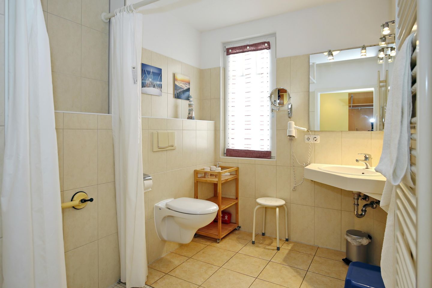 Das behindertenfreundliche Bad verfügt über ein unterfahrbares Waschbecken, eine Dusche mit geringer Einstiegshöhe sowie ein WC und einen Föhn. In der gesamten Ferienwohnung sind Feinsteinfliesen verlegt.