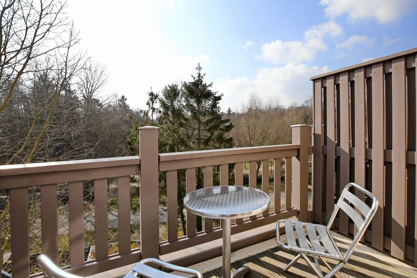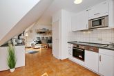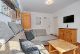 Die im Wohnbereich integrierte Küchenzeile ist mit einem Kühlschrank mit Gefrierfach, einem 2-Plattenkochfeld, einem Geschirrspüler sowie einer Mikrowelle ausgestattet. Natürlich stehen dir auch eine Kaffeemaschine, ein Toaster und ein Wasserkocher zur Verfügung. Der Essbereich bietet dir ausreichend Platz für gemeinsame Mahlzeiten.