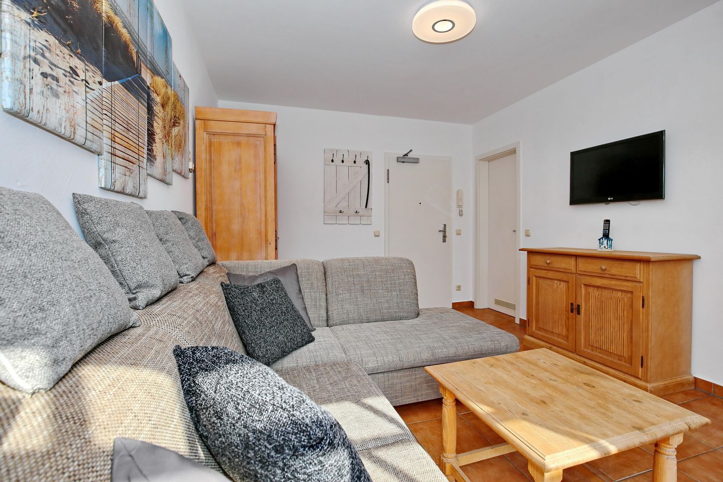 Der Wohnbereich der Ferienwohnung ist mit einem Sofa und zwei Korbsesseln gemütlich eingerichtet. Für deine Unterhaltung steht ein Flachbild-TV bereit. Außerdem verfügt die Wohnung über einen kostenlosen WLAN-Anschluss.