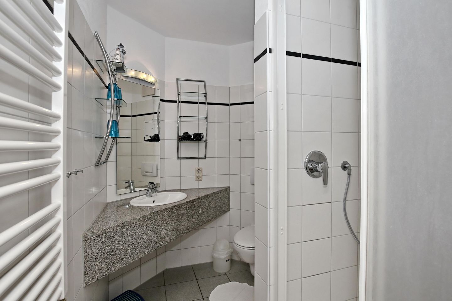 Das Bad der Ferienwohnung ist für dich mit einer Dusche, einem WC und einem Föhn ausgestattet. Die Ferienwohnung ist mit einem Fliesenboden ausgestattet.