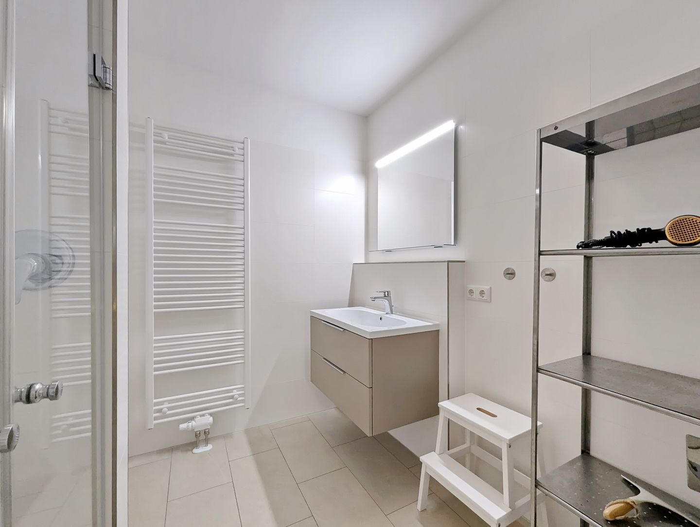 Das geflieste Badezimmer verfügt über einen Waschtisch, eine bodengleiche Dusche und ein WC. In der gesamten Ferienwohnung wurden Fliesen verlegt.