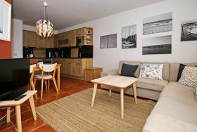 Im Wohnbereich steht dir ein komfortables Ecksofa zur Verfügung. Auf dem vorhandenen Flachbild-TV kannst du deine Lieblingsprogramme schauen. Für die musikalische Unterhaltung findest du eine Stereoanlage mit Bluetooth vor.