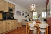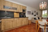 Ebenfalls im Raum integriert ist die Küchenzeile. Diese bietet dir ein Cerankochfeld, einen Backofen, einen Geschirrspüler, einen Kühlschrank mit Gefrierfach und eine Mikrowelle. Selbstverständlich findest du hier auch eine Kaffeemaschine, einen Wasserkocher und einen Toaster vor. Des Weiteren findest du in der Küche noch eine Tapmaschine und eine Nespressomaschine vor. Im angrenzenden Essbereich kannst du deine gemeinsamen Mahlzeiten zu viert genießen.