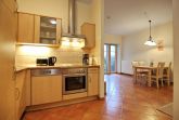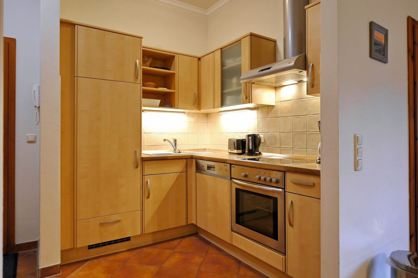 Die moderne Küchenzeile ist vollständig ausgestattet und verfügt über ein vierfaches Cerankochfeld, einen Backofen, einen Geschirrspüler sowie einen Kühlschrank mit Gefrierfach. Außerdem stehen Ihnen Wasserkocher, Kaffeemaschine und Toaster zur Verfügung.