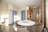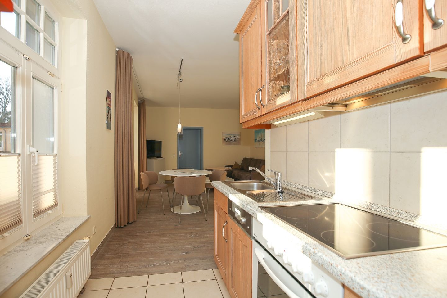 Die im Wohnzimmer integrierte Küchenzeile beinhaltet ein 4-Zonen-Cerankochfeld mit Backofen, einen Kühlschrank mit Gefrierfach, eine Mikrowelle und einen Geschirrspüler. Ebenso sind ein Wasserkocher, ein Toaster und eine Kaffeemaschine vorhanden.