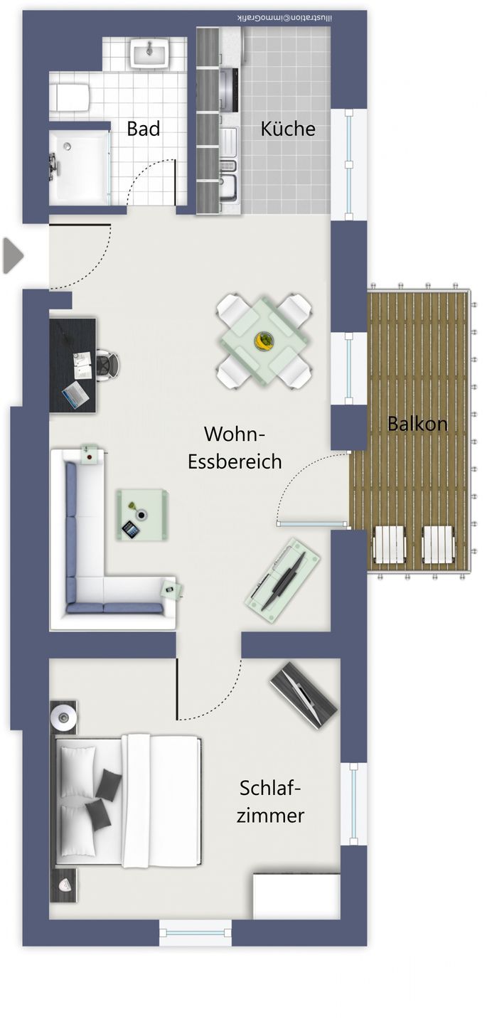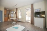 Das Wohnzimmer ist mit einer gemütlichen Eck-Schlafcouch, einem Schreibtisch und einem Flachbild-TV ausgestattet. Im angrenzenden Essbereich hast du ausreichend Platz für gemeinsame Mahlzeiten. Im Wohnbereich befindet sich der Zugang zum Südbalkon.