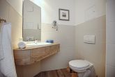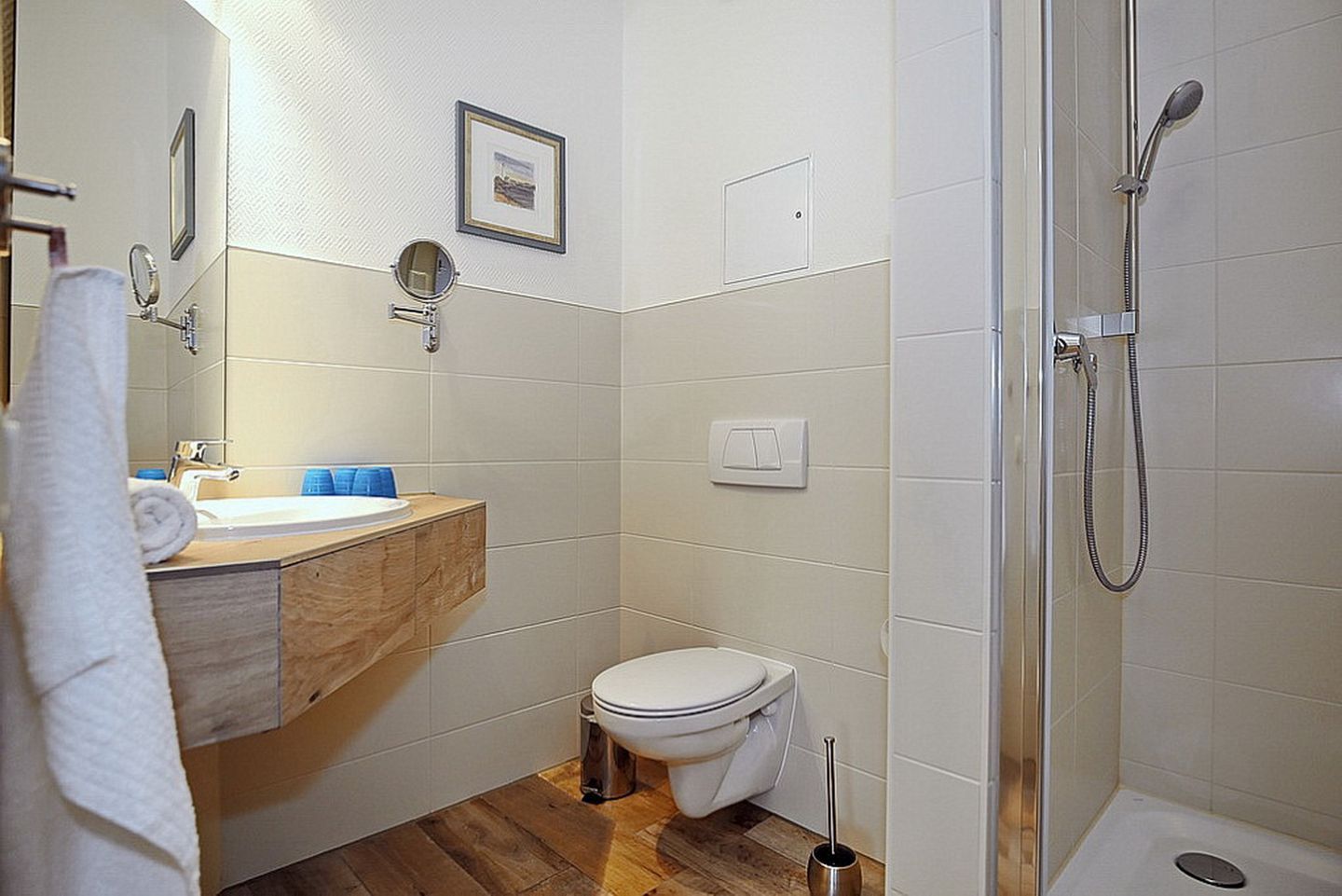 Das moderne Duschbad der Ferienwohnung hat eine Glasdusche, WC, einen Kosmetikspiegel und einen Föhn. Die komplette Wohnung wurde mit hochwertigem PVC-Belag ausgelegt.