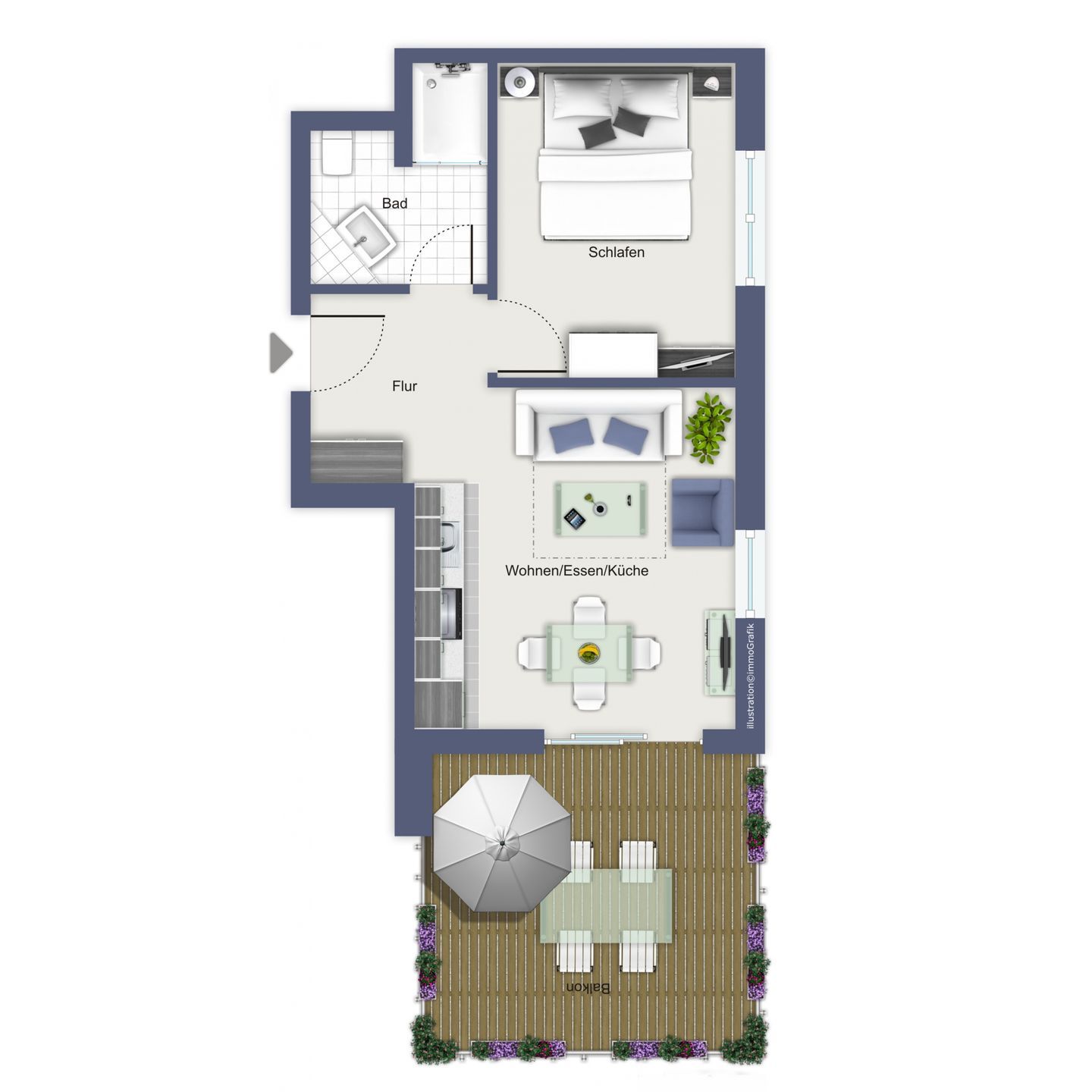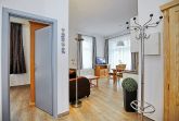 Du betrittst den großen möblierten Balkon der Ferienwohnung vom Wohnzimmer aus. Der Wohnraum ist mit einer gemütlichen und modernen Schlafcouch und einem Sessel eingerichtet. Für Unterhaltung sorgen ein Flachbild-TV, ein Radio und ein DVD-Player. Ebenso kannst du das kostenlose WLAN nutzen.