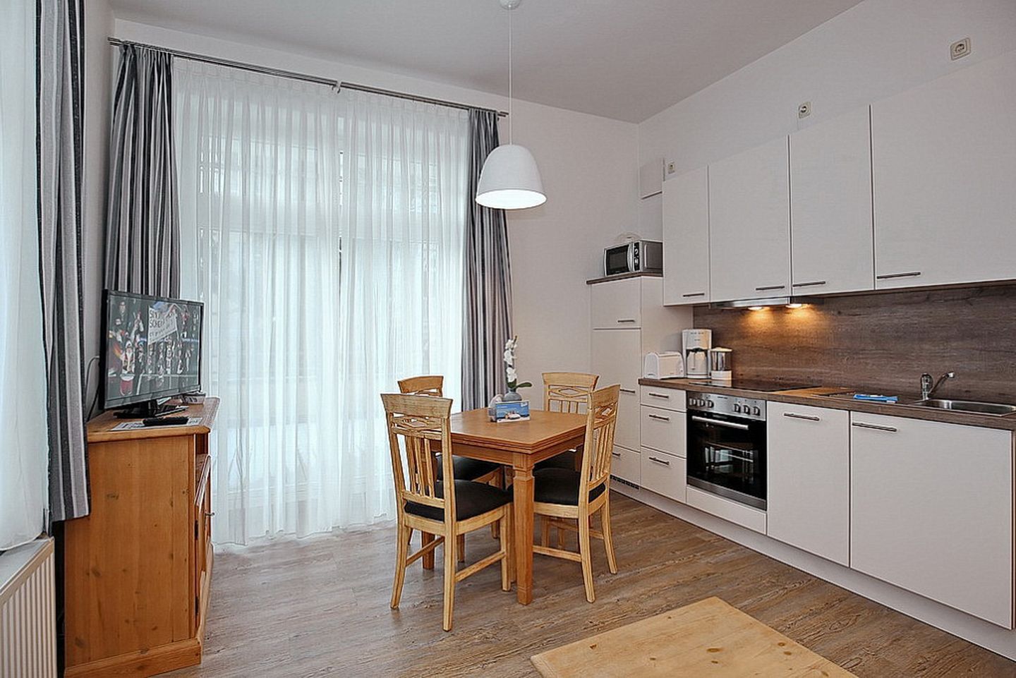 Die integrierte Küchenzeile ist mit Geschirrspüler, Kühlschrank mit Gefrierfach, Backofen, 4-Zonen-Cerankochfeld und Mikrowelle vollständig eingerichtet. Ebenso stehen dir Kaffeemaschine, Wasserkocher und Toaster zur Verfügung. Am Esstisch, gleich neben der Küchenzeile, hast du bequem Platz für deine Urlaubsmahlzeiten.