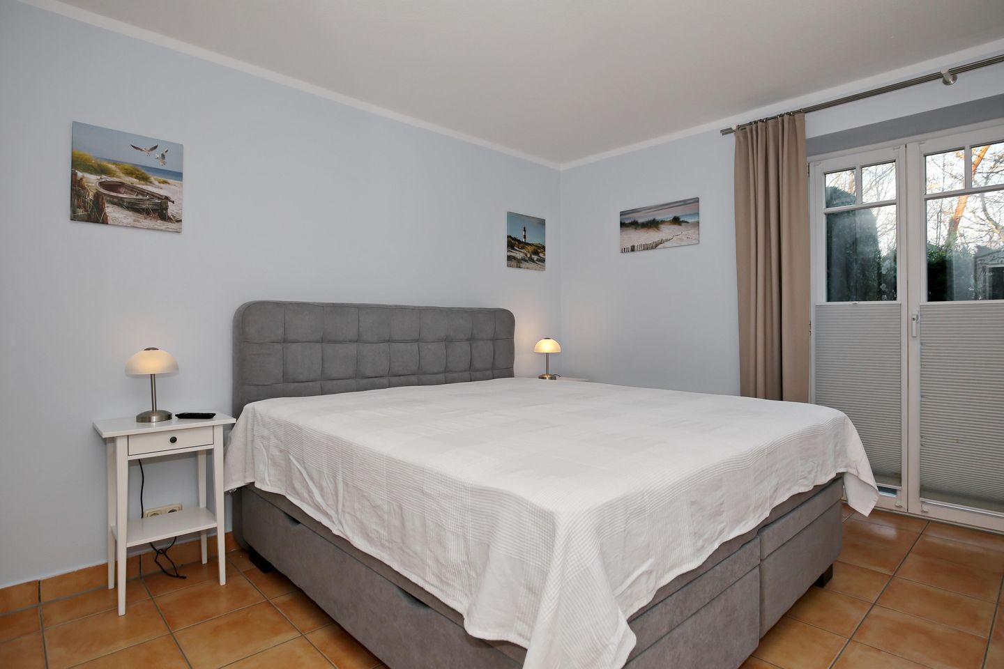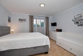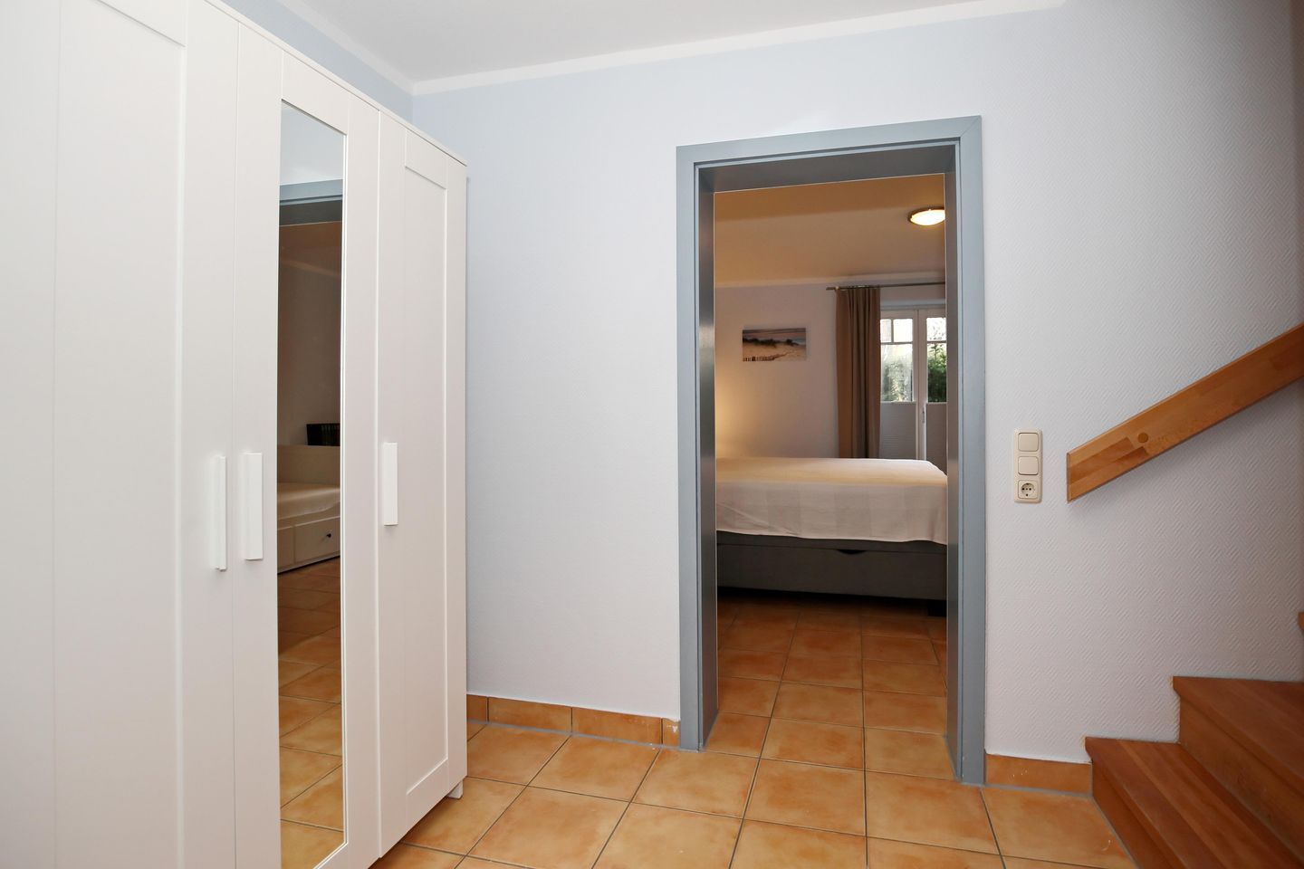 Für Ihren erholsamen Schlaf finden Sie im Schlafzimmer ein Boxspringbett (180 x 200 cm) und ein Einzelbett (80 x 200 cm) vor. Stauraum für Ihr Urlaubsgepäck bieten Ihnen der Kleiderschrank auf dem Flur sowie eine Kommode im Schlafzimmer. Hier steht Ihnen auch ein zweiter Fernseher mit integriertem DVD-Player sowie eine Auswahl an Büchern zur Verfügung. Als Sichtschutz dienen im Wohn- und Schlafbereich die Vorhänge an den Fenstern.
