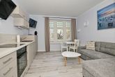 Der Wohnraum ist mit einer gemütlichen und modernen Doppelschlafcouch (140 x 200 cm) eingerichtet. Für Unterhaltung sorgen ein Flachbild-TV und ein DVD-Player. Ebenso können Sie das kostenlose WLAN nutzen.
