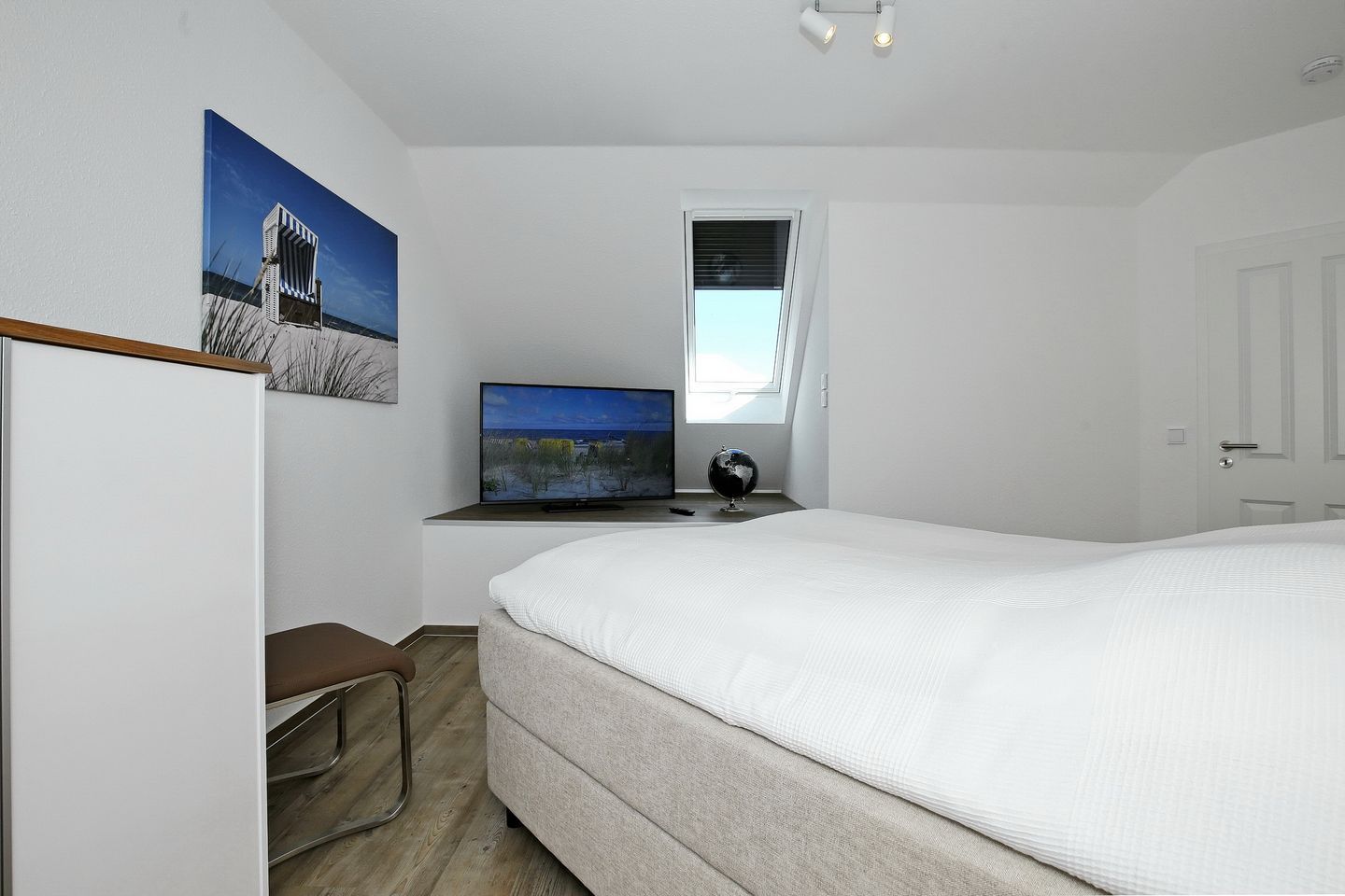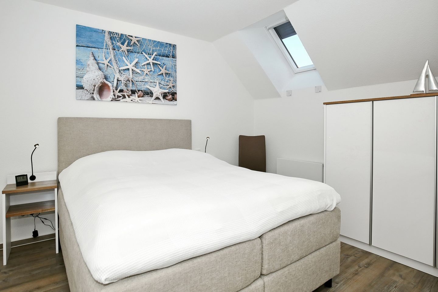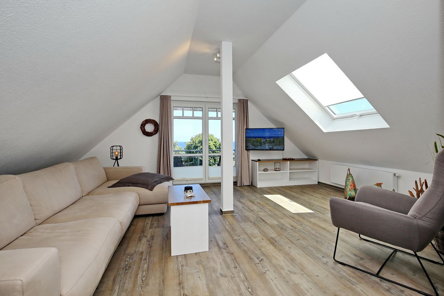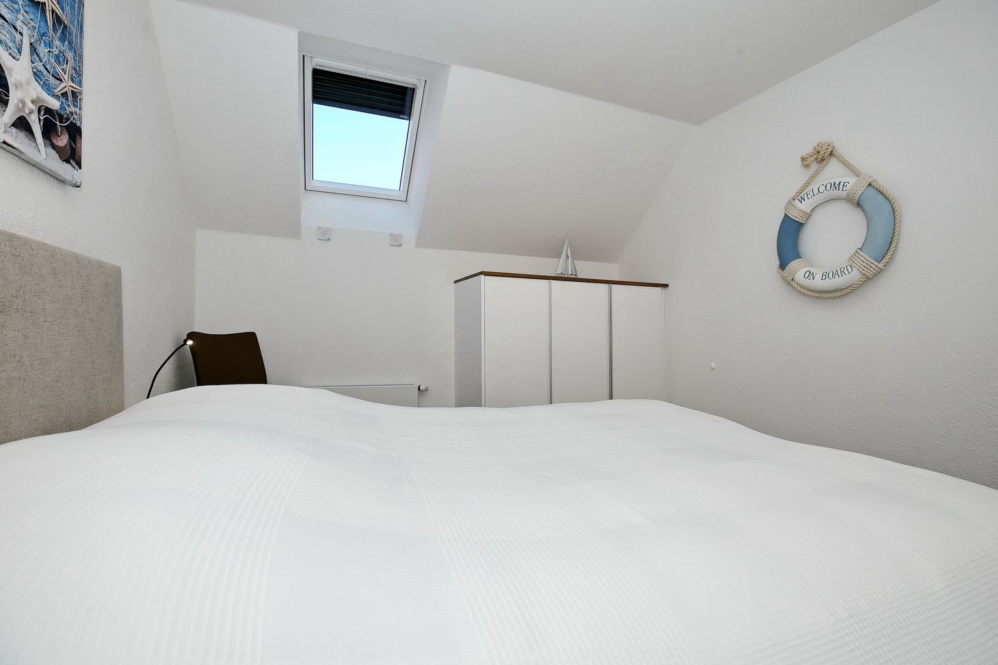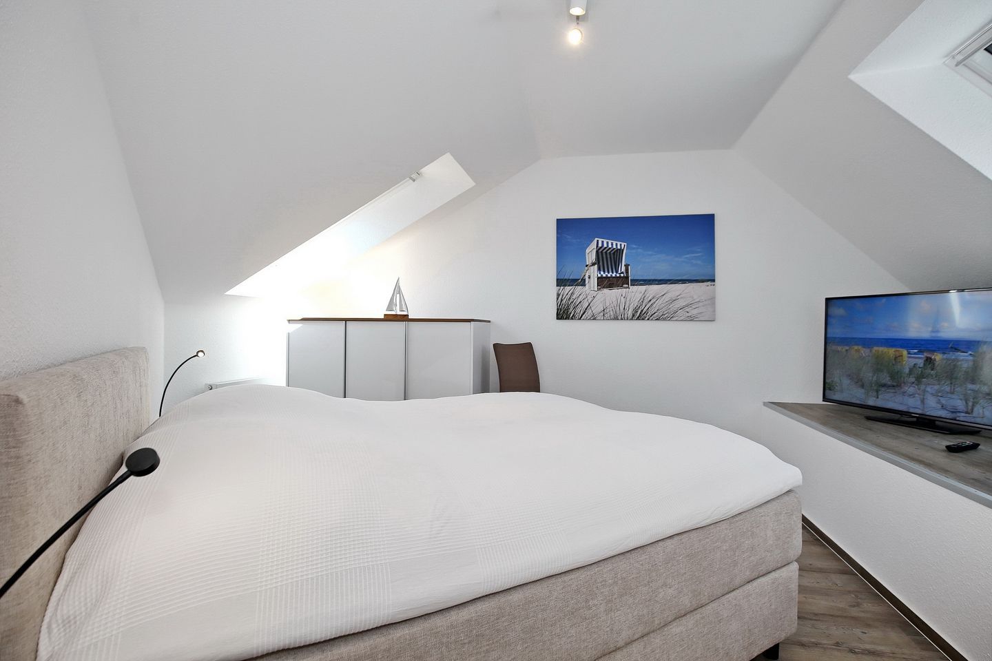 Der Wohnraum der Ferienwohnung befindet sich in der oberen Etage mit einem wunderschönen Ausblick zum Yachthafen und lädt mit einer gemütlichen Couch, einem Sessel und einem modernen Flachbild-TV zum Verweilen ein. Auch erwartet dich in der oberen Etage ein weiteres Schlafzimmer mit einem Doppelbett (160 cm x 200 cm), einer kleinen Kommode und einem Flachbild-TV.