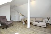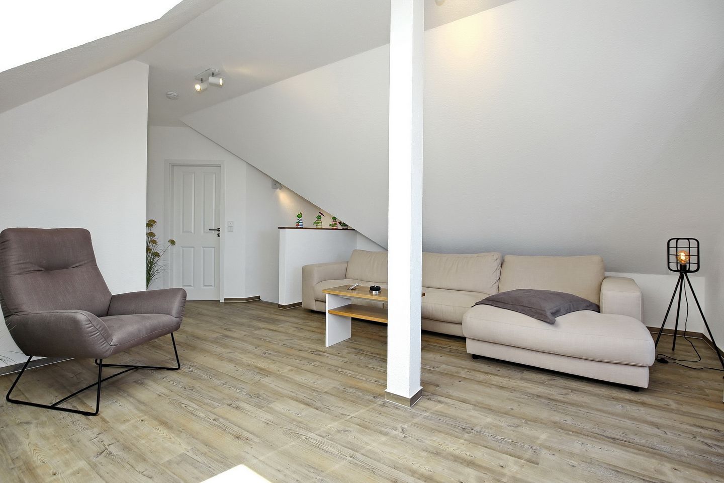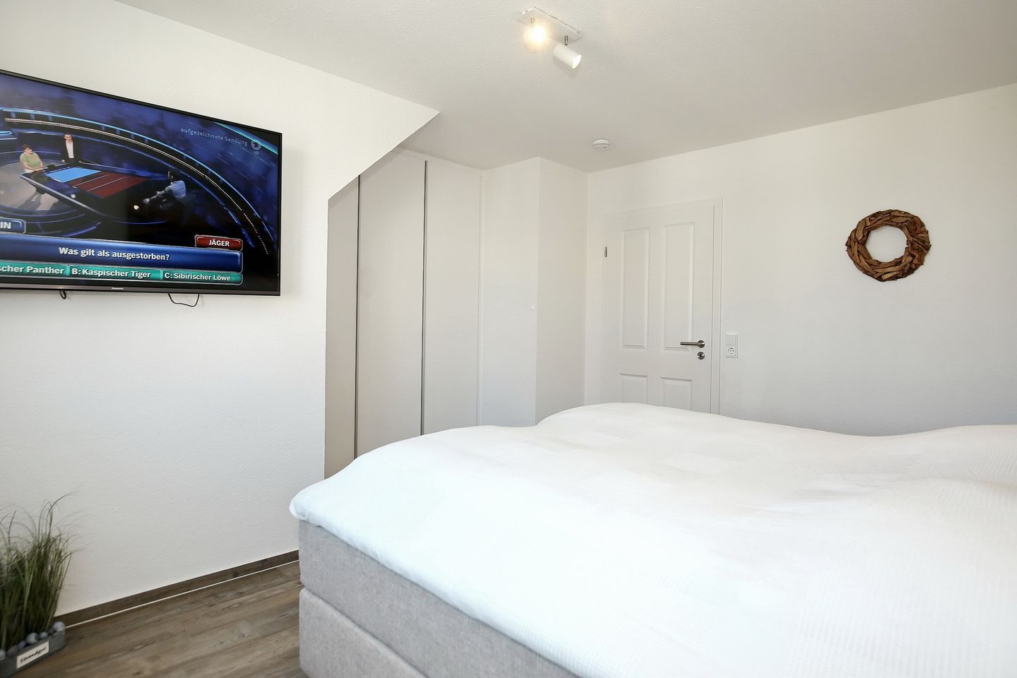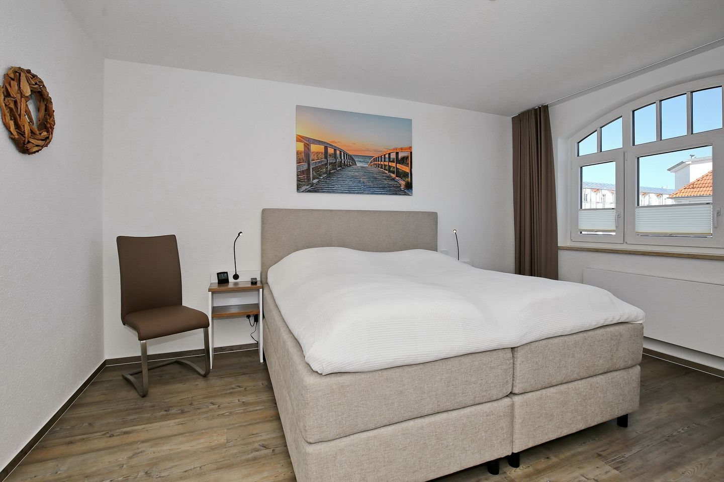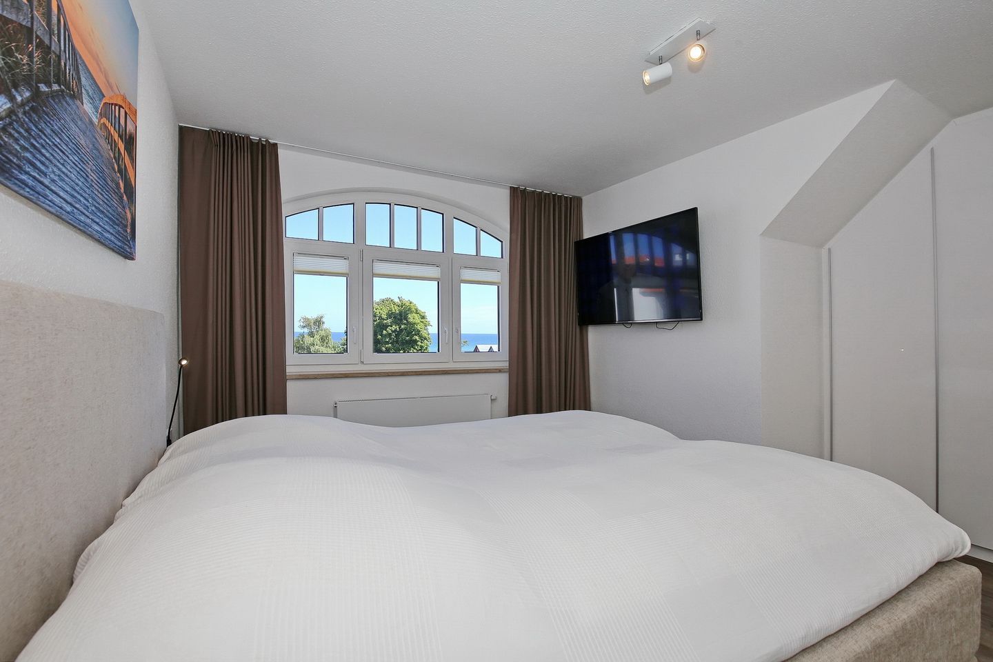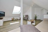 Der Wohnraum der Ferienwohnung befindet sich in der oberen Etage mit einem wunderschönen Ausblick zum Yachthafen und lädt mit einer gemütlichen Couch, einem Sessel und einem modernen Flachbild-TV zum Verweilen ein. Auch erwartet dich in der oberen Etage ein weiteres Schlafzimmer mit einem Doppelbett (160 cm x 200 cm), einer kleinen Kommode und einem Flachbild-TV.