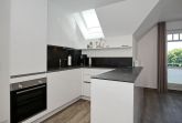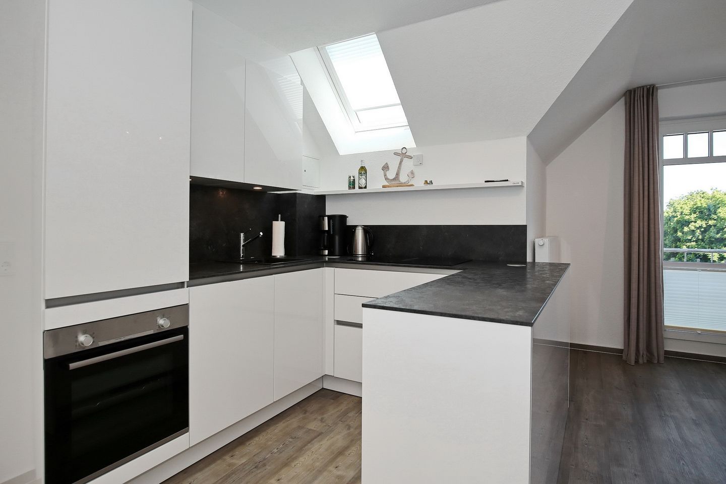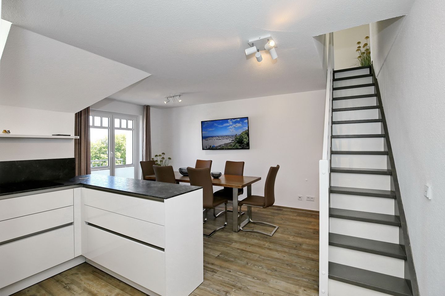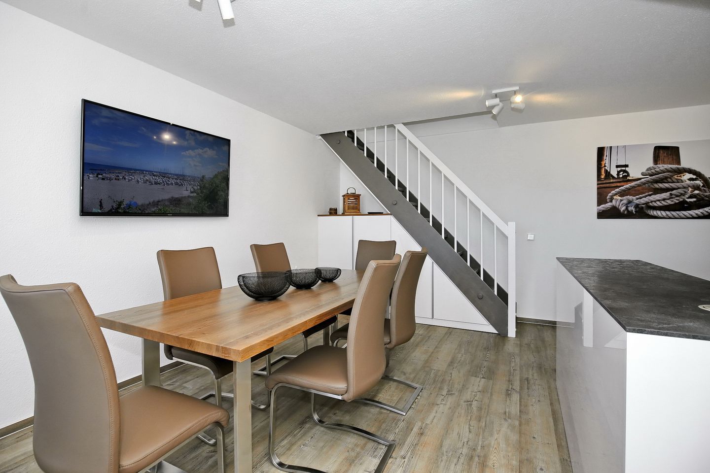 Im unteren Bereich erwartet dich ein großes Esszimmer mit einer Küche, diese ist mit einem Kühlschrank mit Gefrierfach, einem Geschirrspüler, einem 4-Platten-Cerankochfeld und einem Backofen ausgestattet. Vervollständigt wird die Ausstattung der Küche durch einen Toaster, einen Wasserkocher und eine Kaffeemaschine. Von hier aus geht es auf den zweiten Balkon zur Nordseite mit Meerblick.