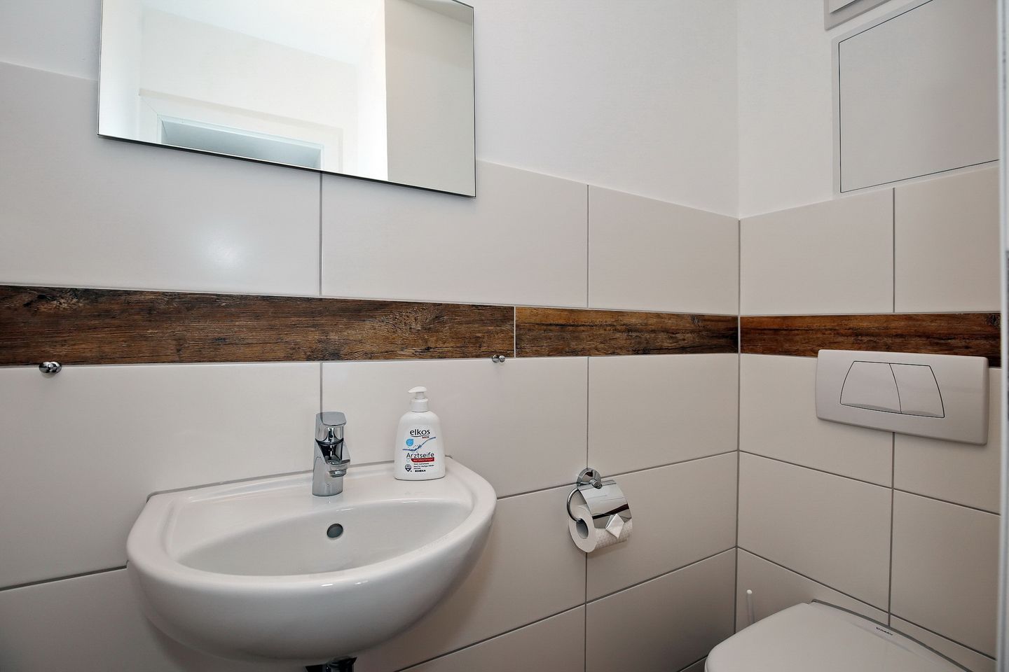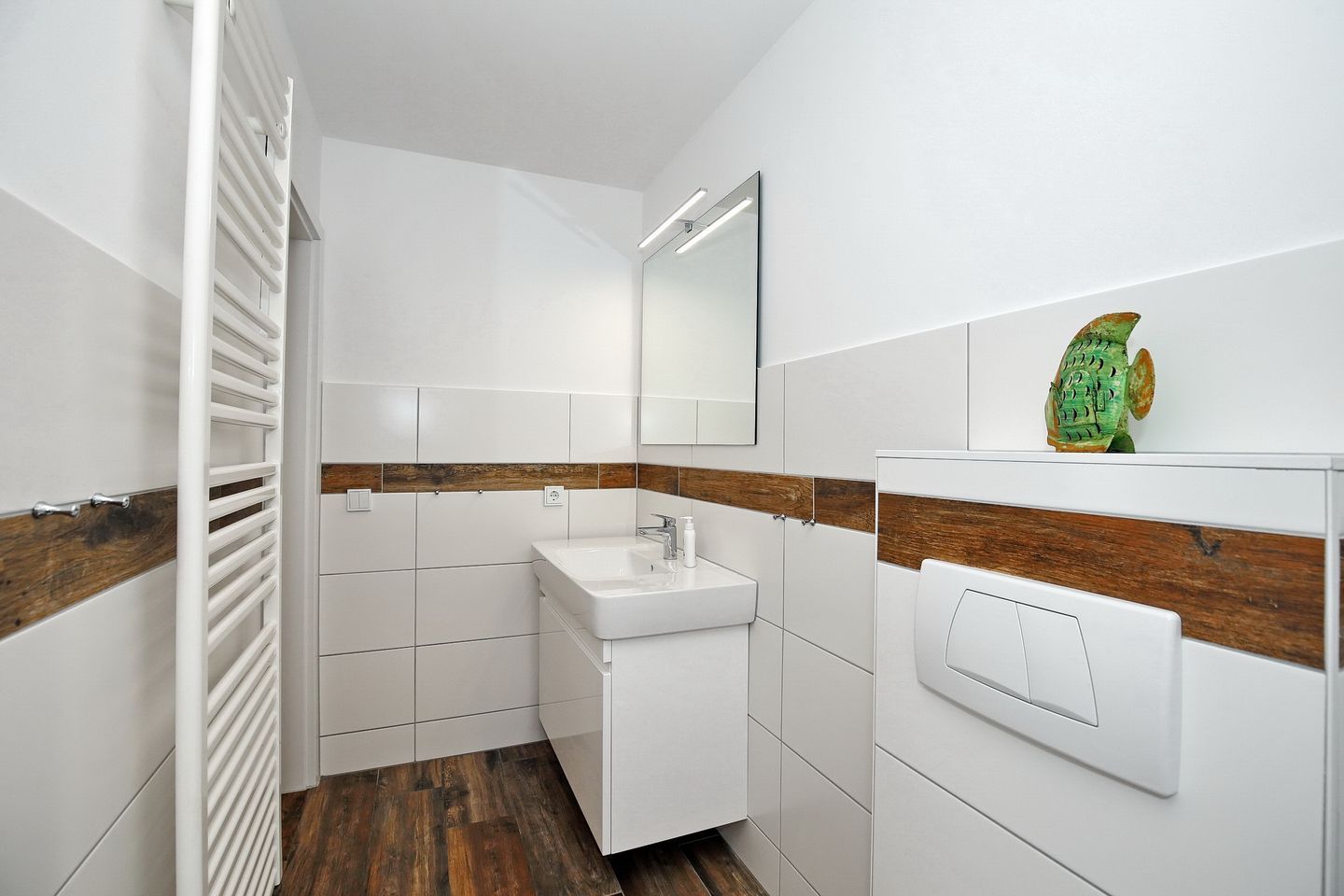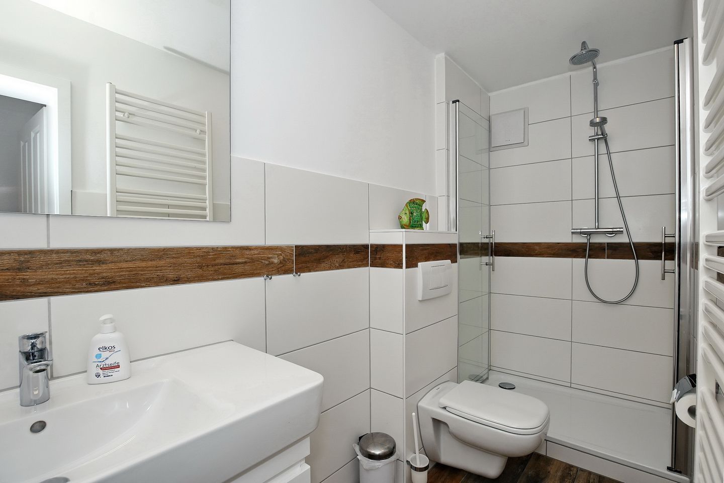 Die Ferienwohnung verfügt über ein geräumiges gefliestes Duschbad mit WC sowie über ein Gäste-WC. Für deine Waschutensilien findest du genügend Ablagefläche. In der gesamten Wohnung wurde Vinyl verlegt.