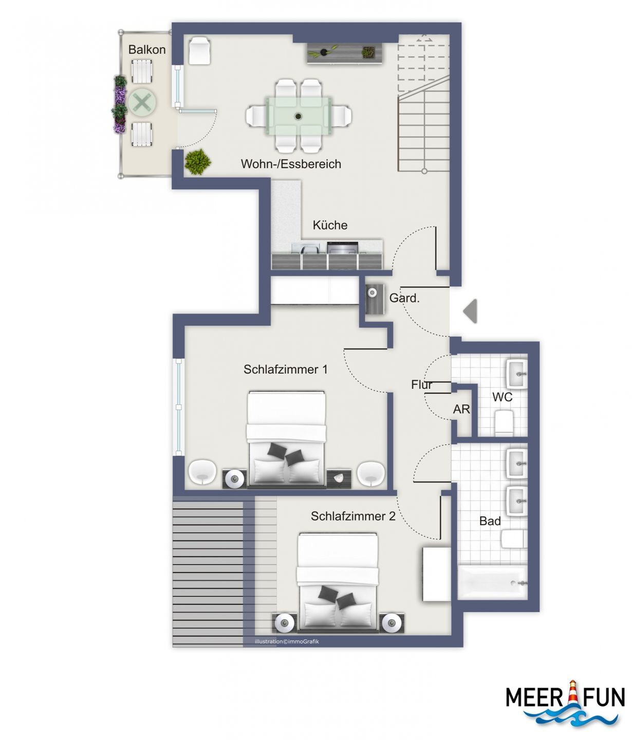 Die Ferienwohnung befindet sich im 3. Obergeschoss. Mit einer Größe von 99 m² erstreckt sie sich über 2 Etagen. Im unteren Bereich befinden sich ein Esszimmer mit angrenzender Küchenzeile, zwei Schlafzimmer, ein Duschbad und ein Gäste-WC. Im oberen Bereich stehen dir noch ein weiteres Schlafzimmer sowie der Wohnbereich zur Verfügung. Die Entfernung zum Strand beträgt etwa 100 Meter.