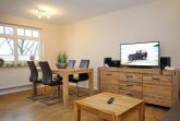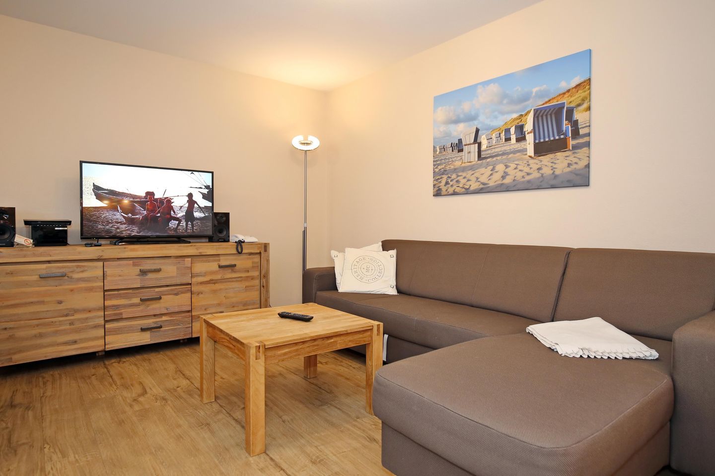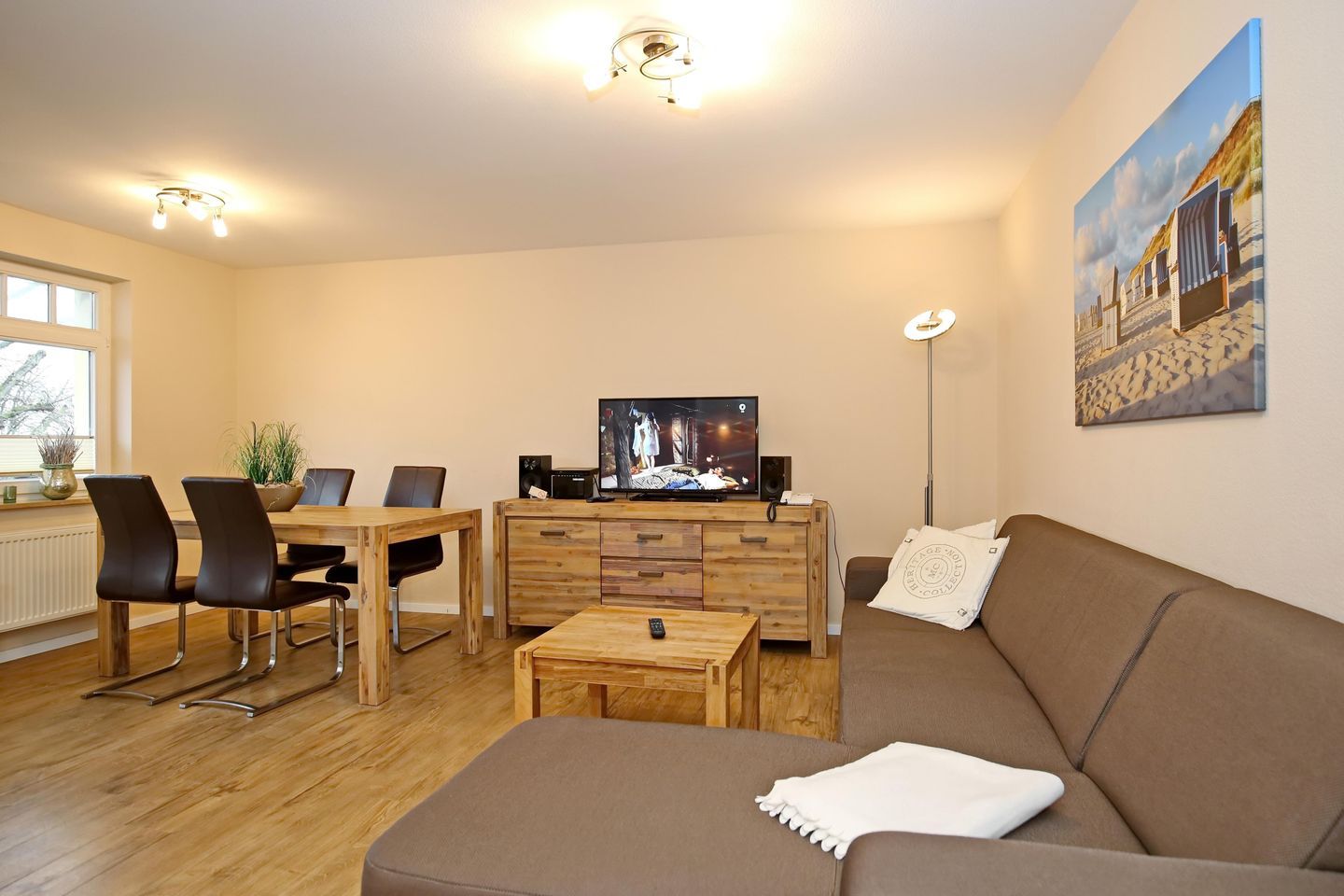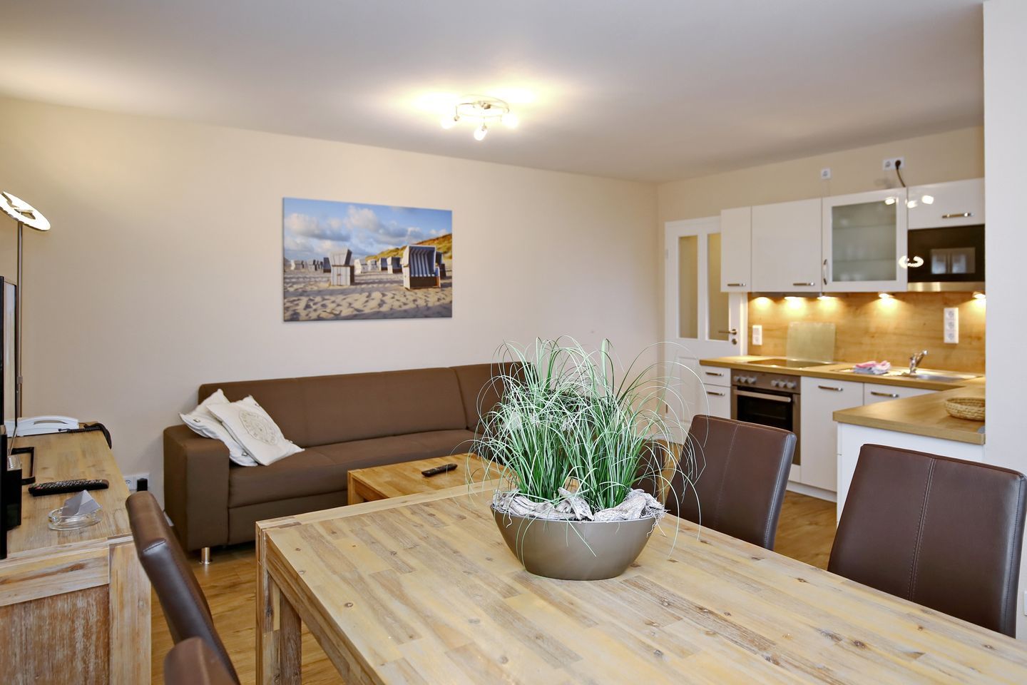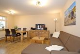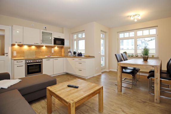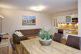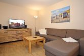 Der stilvoll eingerichtete Wohnbereich lädt mit einer gemütlichen Schlafcouch (160 cm x 200 cm), einem modernen Flachbild-TV sowie einer Stereoanlage zum Entspannen ein. Von hier aus gelangen Sie auf den Balkon zur Nordseite. Am Esstisch finden Sie ausreichend Platz für gemeinsame Mahlzeiten.