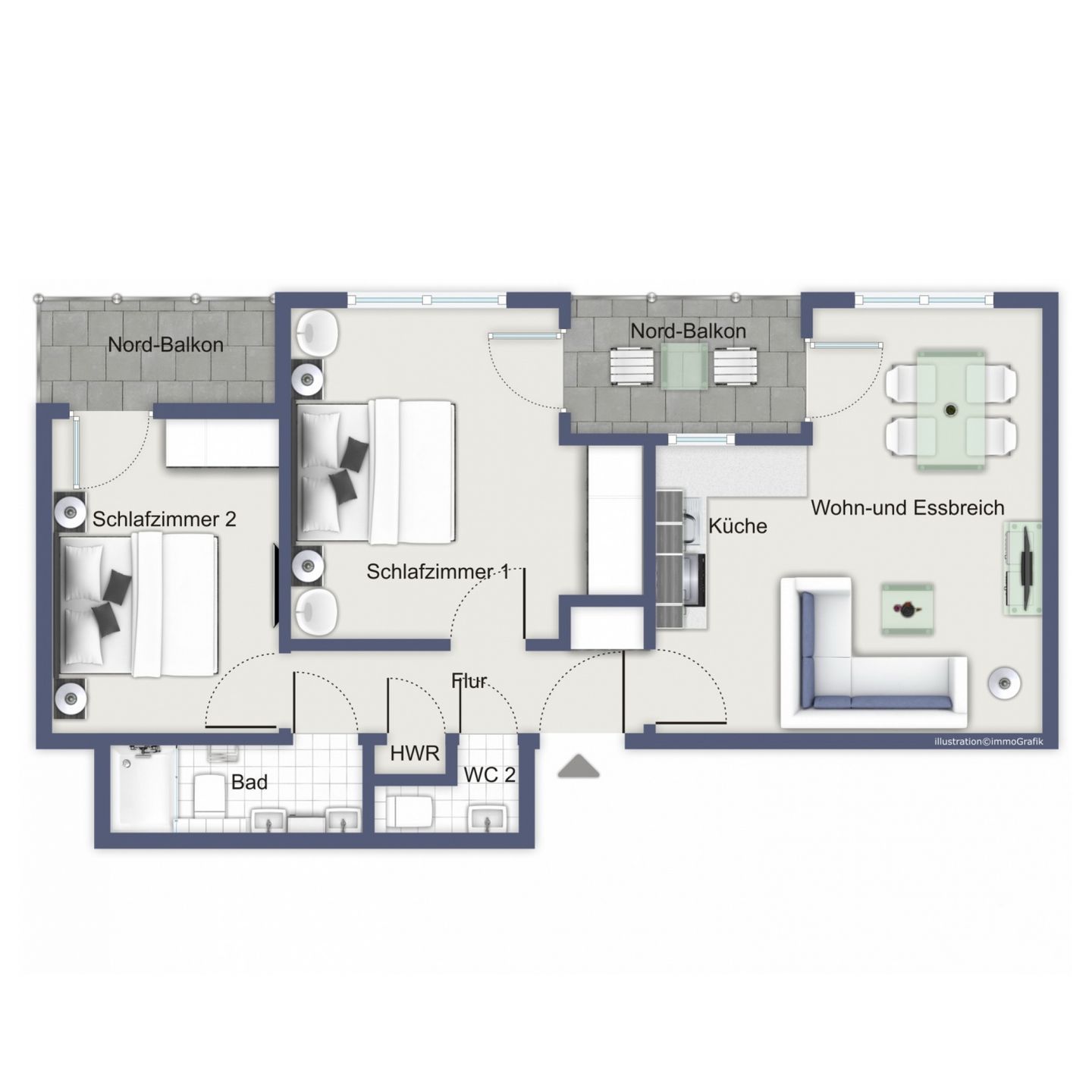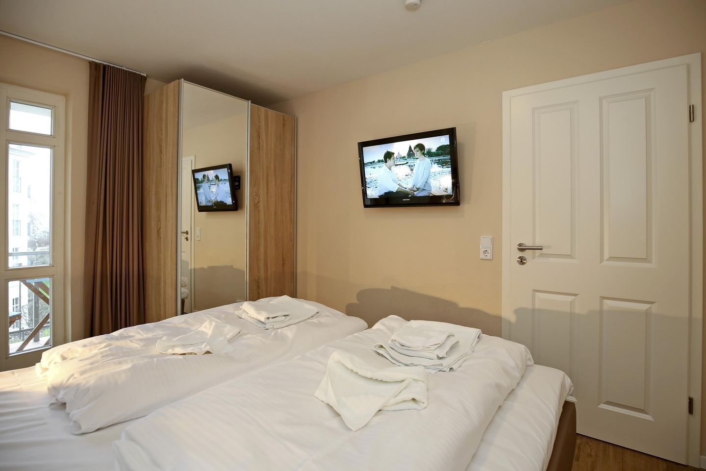 In beiden Schlafzimmern sorgen komfortable Boxspringbetten (jeweils 180 cm x 200 cm) für erholsame Nächte. Großzügige Schwebetürenschränke bieten ausreichend Stauraum. Die Vorhänge ermöglichen eine angenehme Verdunklung. Von beiden Schlafzimmern aus haben Sie Zugang zu den Nordbalkonen.