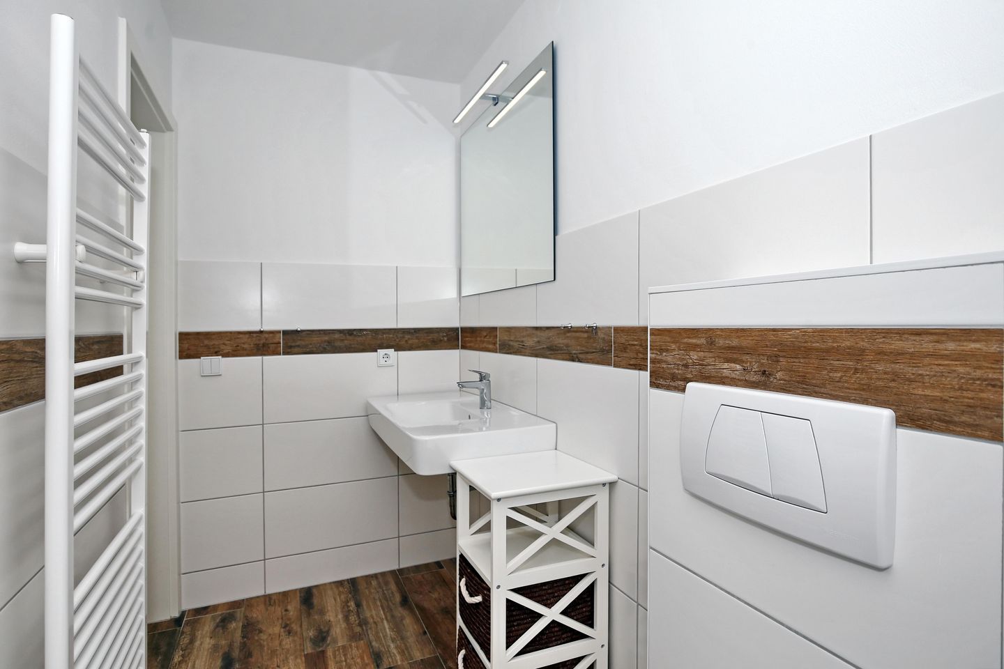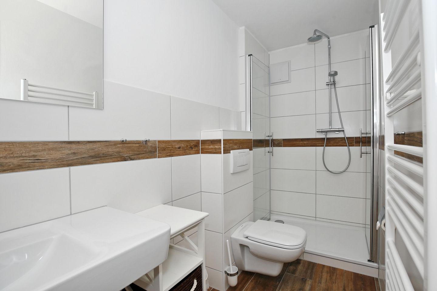 Die Ferienwohnung verfügt über ein modernes, gefliestes Duschbad mit WC und zwei Waschbecken sowie ein zusätzliches Gäste-WC. Für Ihre persönlichen Utensilien steht Ihnen ausreichend Ablagefläche zur Verfügung. In der gesamten Wohnung ist ein hochwertiger Vinylboden verlegt. Es handelt sich um eine Nichtraucherwohnung, in der Haustiere nicht gestattet sind.