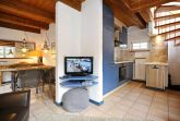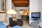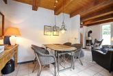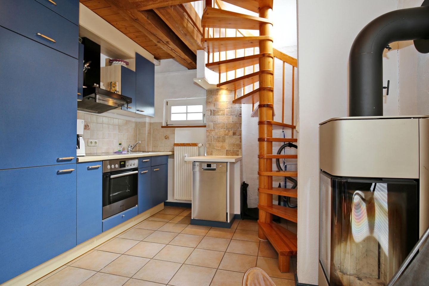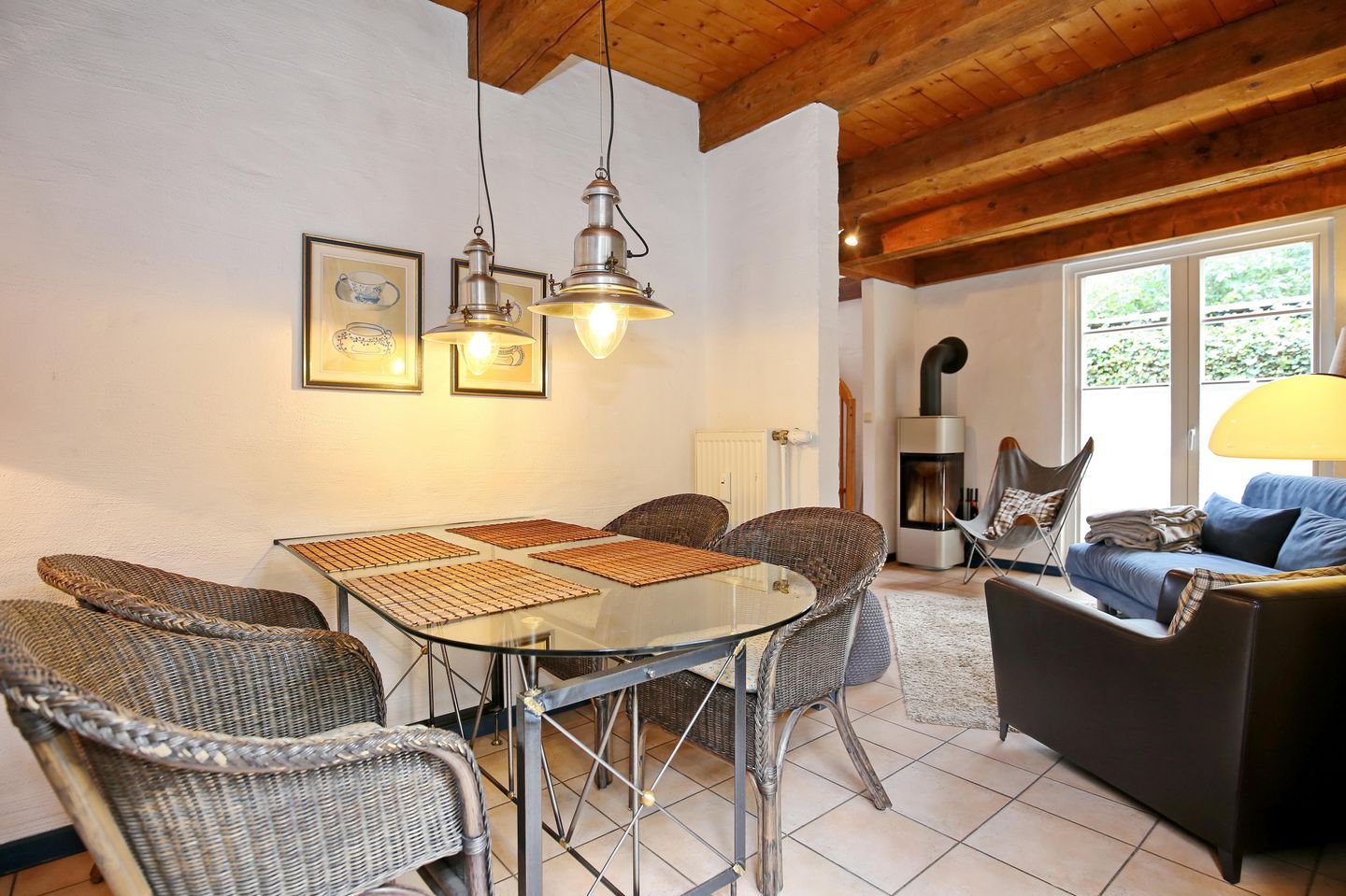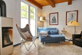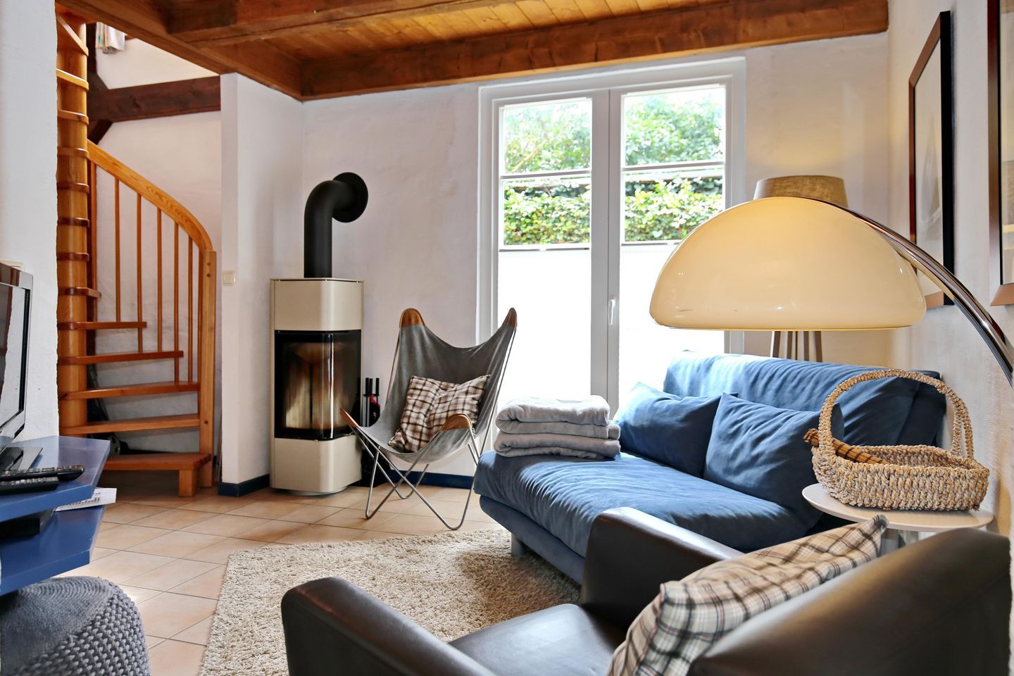 Der Wohnbereich der Ferienwohnung liegt im Erdgeschoss und ist mit einer gemütlichen ausziehbaren Schlafcouch und zwei Sesseln, sowie einer Blu-ray-Anlage und einem Flachbild-TV ausgestattet. Im Wohnbereich befindet sich auch ein Kaminofen. Durch ein großes Südfenster wird der Wohn-und Essbereich lichtdurchflutet und der anschließende Essbereich lädt zu gemeinsamen Mahlzeiten ein.
