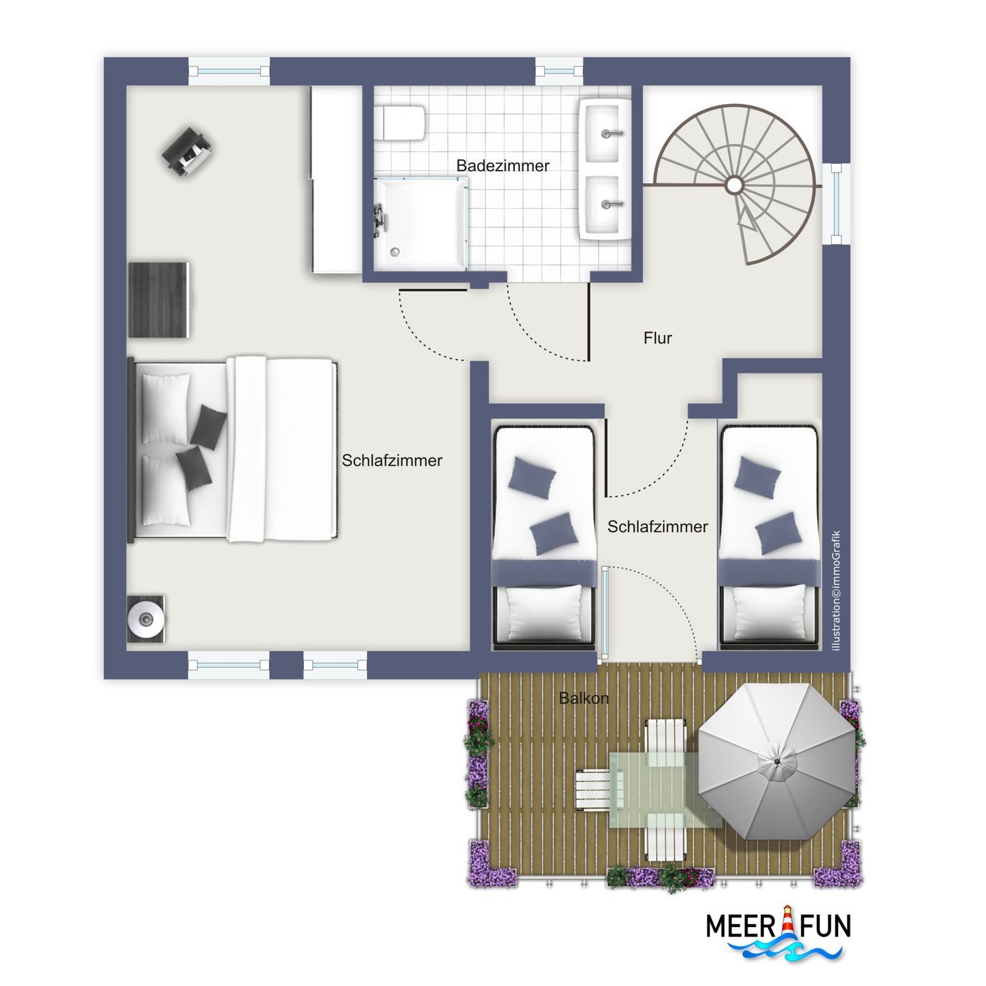 Über eine Wendeltreppe gelangst du in das Obergeschoss und damit zu den Schlafzimmern. Im ersten Schlafzimmer bietet dir ein Doppelbett eine erholsame Nachtruhe. Zwei Nachttische und ein Kleiderschrank können für dein Urlaubsgepäck genutzt werden. Das zweite Schlafzimmer ist mit 2 Einzelbetten eingerichtet. Du kannst jeweils Vorhänge als Sichtschutz oder zum Verdunkeln verwenden. Im Flur befindet sich ein weiterer Kleiderschrank.