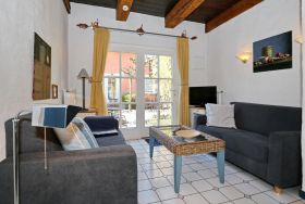 Der Wohnbereich der Ferienwohnung lädt mit zwei Couchen zu geselligen Abenden ein. Zur Unterhaltung stehen ein Flachbild-TV und eine Stereoanlage für dich bereit. Der angrenzende Essbereich bietet 4 Personen viel Platz für gemütliche Mahlzeiten.