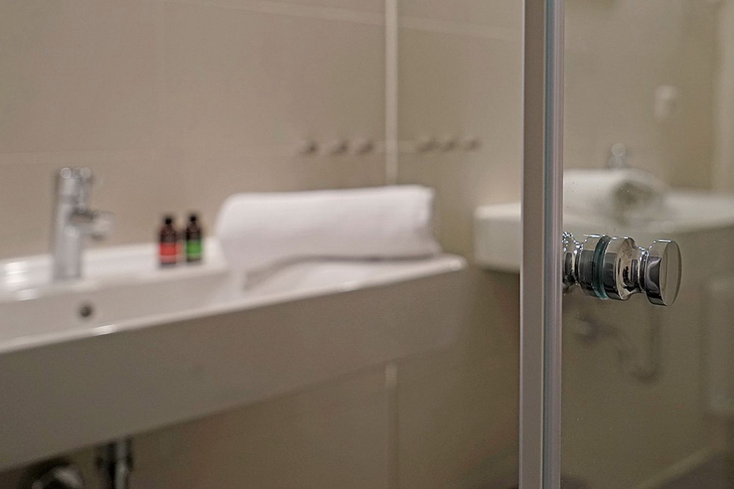 Zum gefliesten Bad mit WC und ebenerdiger Dusche gehören ein Waschtisch mit Ablagefläche und ein Rollregal.