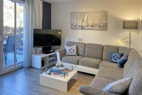 Die Wohnung befindet sich im Erdgeschoss auf der Nordwestseite des Hauses und verfügt über eine schöne Terrasse. Der Boden ist mit Designbelag ausgelegt. Im offenen Wohnbereich finden Sie eine moderne Couch, einen Couchtisch, einen Flatscreen-TV mit Amazon-Fire-Stick (WLAN ohne Gewähr), einen Blu-Ray-Player und eine Stereoanlage.